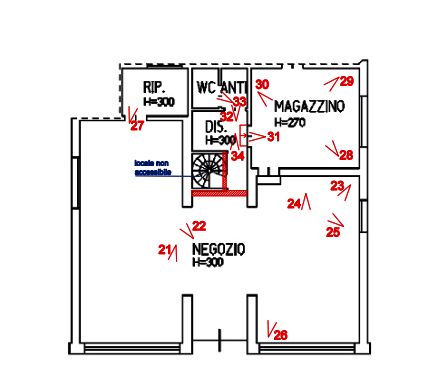 Il negozio è posto al piano terra ed è composto da magazzino, ripostiglio, disimpegno,antibagno e bagno per una superficie complessiva di circa 95 mq.