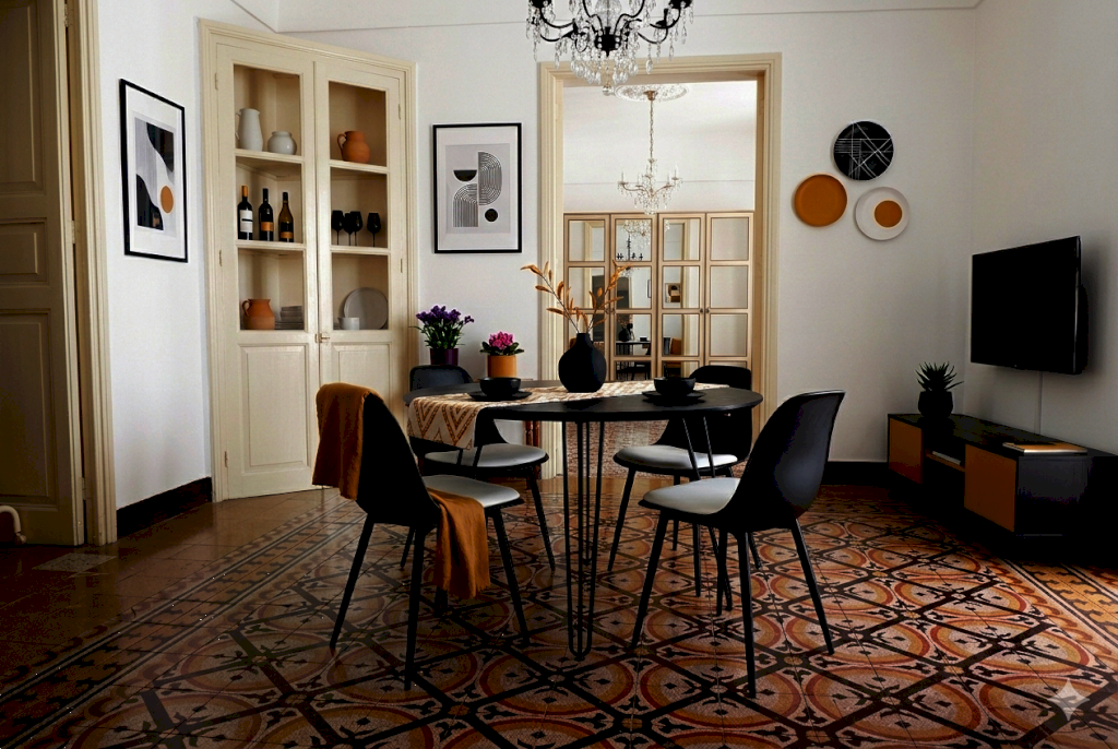 Dal centro delle volte scendono antichi candelabri e le antiche porte interne si aprono sulle varie camere e camerini con i loro pavimenti in maioliche decorate a mano e cementine risalenti ai primi del 900.