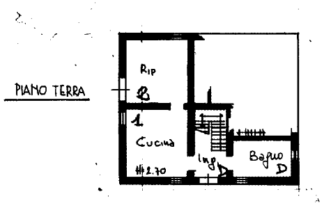 - Prima unità: al piano terra troviamo ingresso con vano scala, cucina, bagno e sottoscala; al primo piano disimpegno e una camera.