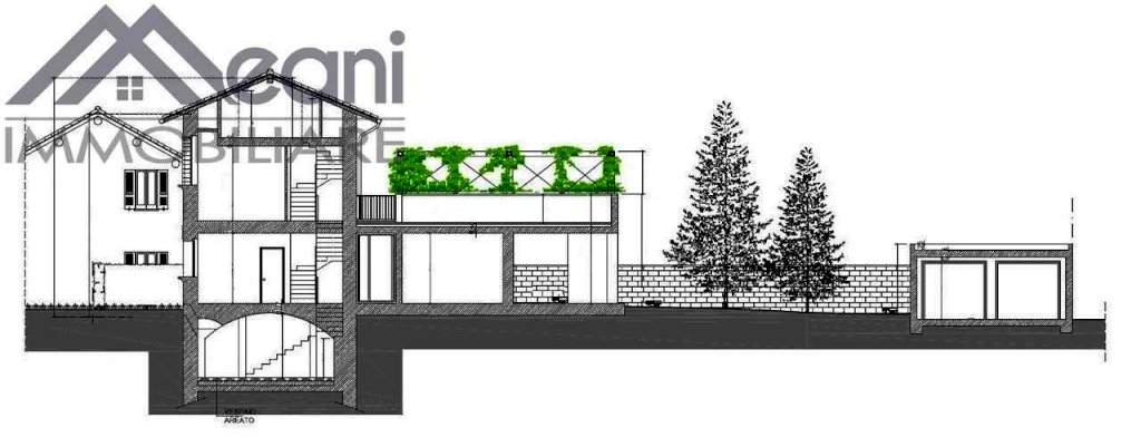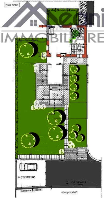 Tornando al LIVELLO TERRENO si trova il meraviglioso giardino perimetrale di 300 mq.ca. e da qui l'accesso all'autorimessa di 34 mq.ca. con area manovra ed accesso al passaggio automobilistico.