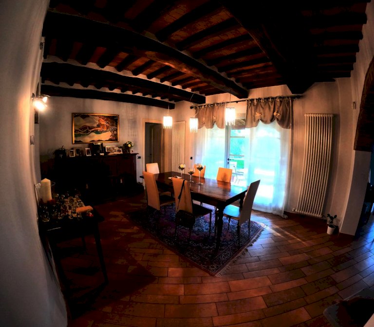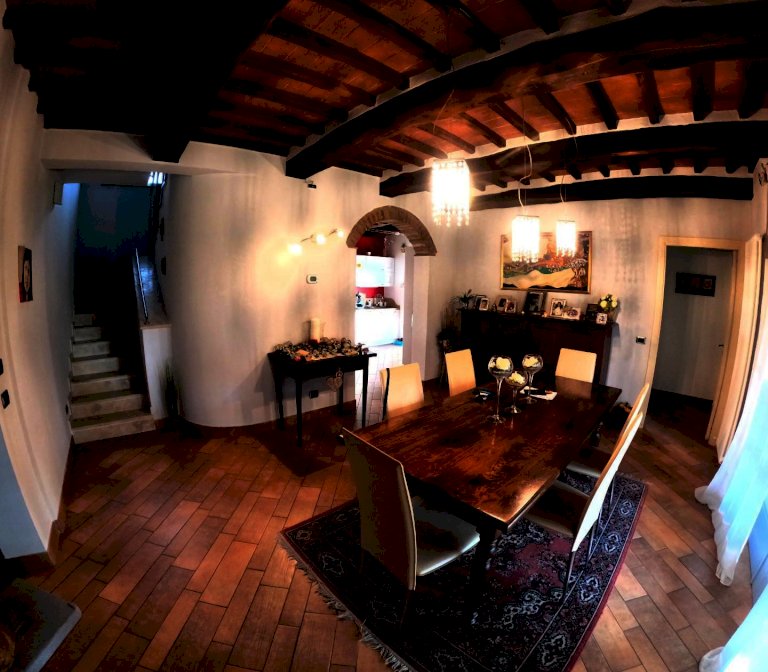 Piano terra: ampia sala pranzo e zona soggiorno con stufa a legno, bagno grande finestrato, due ripostigli