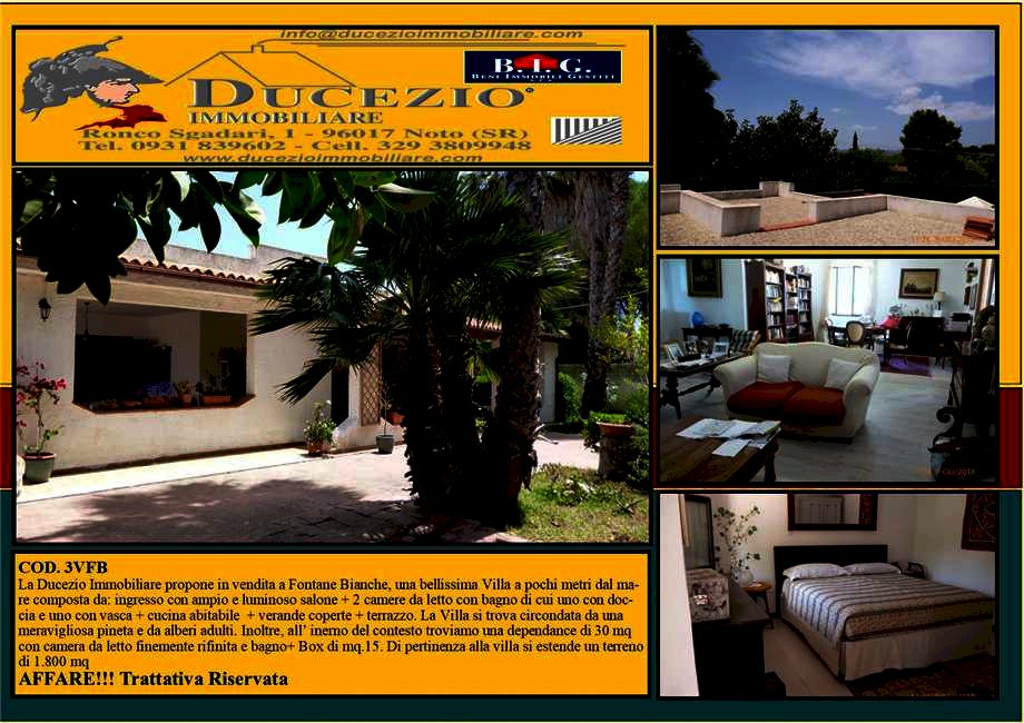 Proponiamo villa in affitto zona Fontane Bianche (SR) a pochi metri dal mare di 180 mq composta da: ingresso con ampio e luminoso salone più due camere da letto con bagno di cui uno con doccia, e uno con la vasca, cucina abitabile, di pertinenza verande coperte e terrazzo, la villa e circondata da una meravigliosa pineta e alberi adulti, inoltre all'interno del contesto troviamo una dependance di 30 mq con camera da letto finemente rifinita e bagno, più box di mq 15. Di pertinenza alla villa si estende un terreno di mq 1.800.