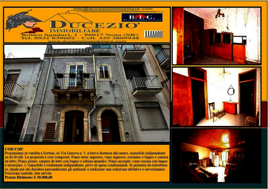 Proponiamo in vendita a Sortino, in Via Genova N° 5, a breve distanza dal centro immobile indipendente su tre livelli. La proprietà è cosi composta: Piano terra ingresso, vano ingresso, cucinino o bagno e camera da letto. Piano primo: camera da letto, con bagno e cabina armadio; piano secondo: vano cucina con bagno e terrazzo. L'immobile è totalmente indipendente, privo di spese condominiali. Si presenta da ristrutturare, ideale per chi desidera personalizzare gli ambienti o realizzare una soluzione abitativa o investimento. Posizione centrale, ben servita.