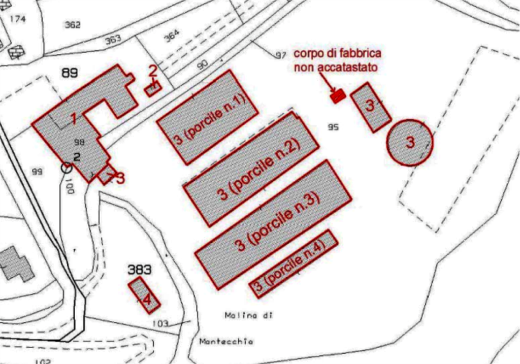 -quattro strutture ad uso porcili che si sviluppano su un unico piano fuori terra e un immobile utilizzato come magazzino (silos) che si sviluppa su due piani fuori terra.