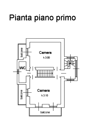 - Unità al piano primo: ingresso, ripostiglio, camera da letto, due balconi, locale cottura e servizio igienico.