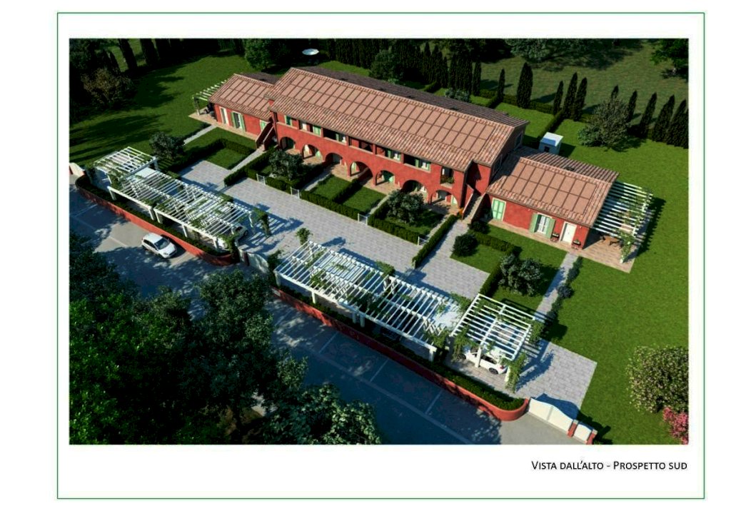 Fornacette - NOSTRA ESCLUSIVA - Nuovo intervento edilizio denominato "Casa Piaggio" posto in zona tranquilla e verde a poca distanza dal centro del paese. Villetta a schiera indipendente di 110 mq. con 116 mq. di giardino disposta su due piani più soffitta praticabile, composta da: ingresso in soggiorno di 26 mq. con porticato, cucina abitabile di 14 mq. con porticato, bagno, scale di accesso al piano primo, dove si trovano 3 camere, bagno, 2 terrazze a loggia 33 mq.. L'immobile è corredato da un ripostiglio esterno e da una casetta in legno con pergolato ad uso posto auto coperto, da ulteriori due posti auto scoperti e da 116 mq. di giardino esclusivo. Rifiniture eccellenti, impianti di ultimissima generazione, non allacciato al gas, fotovoltaico 2,14 Kwh. Consegna primavera 2025 Possibilità di personalizzare i pavimenti, rivestimenti e imbiancature. Classe energetica: A3 - Richiesta 330.000 tratt. Rif. 793