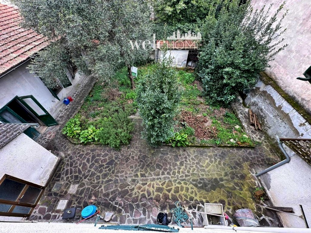 Il piano terra è composto da quattro ampi vani: soggiorno, sala, cucina abitabile con camino a vista e camera matrimoniale. Un corridoio conduce al servizio e al giardino tergale di circa 145 mq, spazio riservato e ideale per vivere l’esterno.