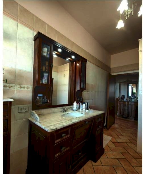 Piano Primo: appartamento principale di circa 135 mq con soggiorno ampio e luminoso con balcone, cucina abitabile con accesso a una grande terrazza (36 mq di loggiato + 48 mq scoperti) collegata da scala esterna al terreno coltivato a olivi e a un resede carrabile con cancello dalla strada principale, dotato di zona coperta per posti auto in totale di mq 550 circa. Completano il piano una camera matrimoniale con accesso alla terrazza, una camere matrimoniali con accesso al balcone , una cameretta e un bagno con doccia finestrato la terrazza di mq 12 circa .