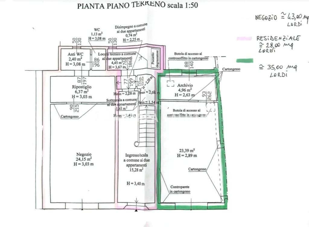 Piano terra 2 NEGOZI di circa 40 mq ciascuno.