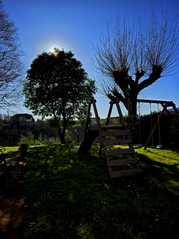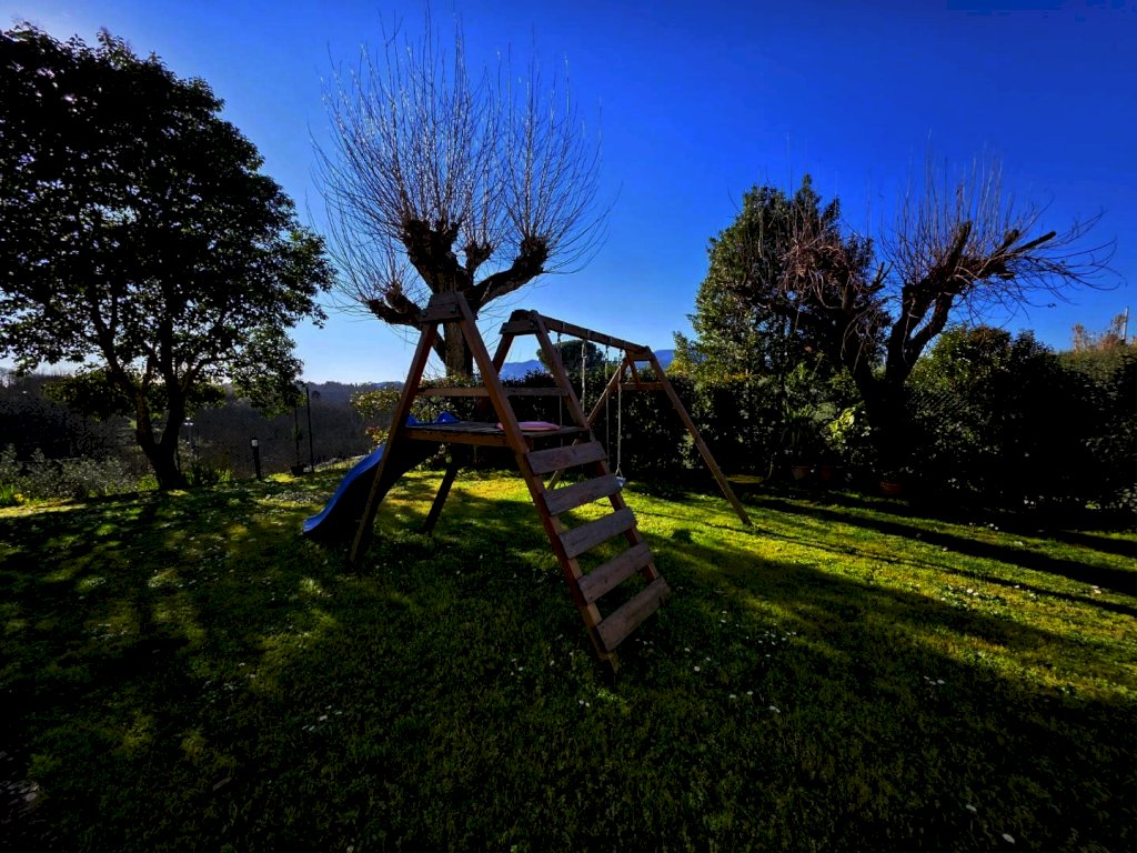Tramite il cancello automatico si accede alla proprietà, che dispone di un bellissimo giardino di circa 700 mq e un terreno di circa 6.000 mq, adattabile a coltivazione e già dotato di un' oliveta con 55 piante.