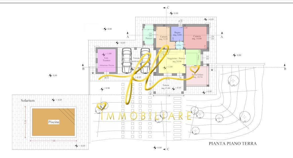 Il progetto prevede un’abitazione composta da luminose zone living in open space con angolo cottura, due camere, un bagno, una serra solare e due portici ideali per vivere gli spazi esterni in ogni stagione. La proprietà include inoltre una raffinata tettoia per due posti auto e un locale tecnico completamente attrezzato.