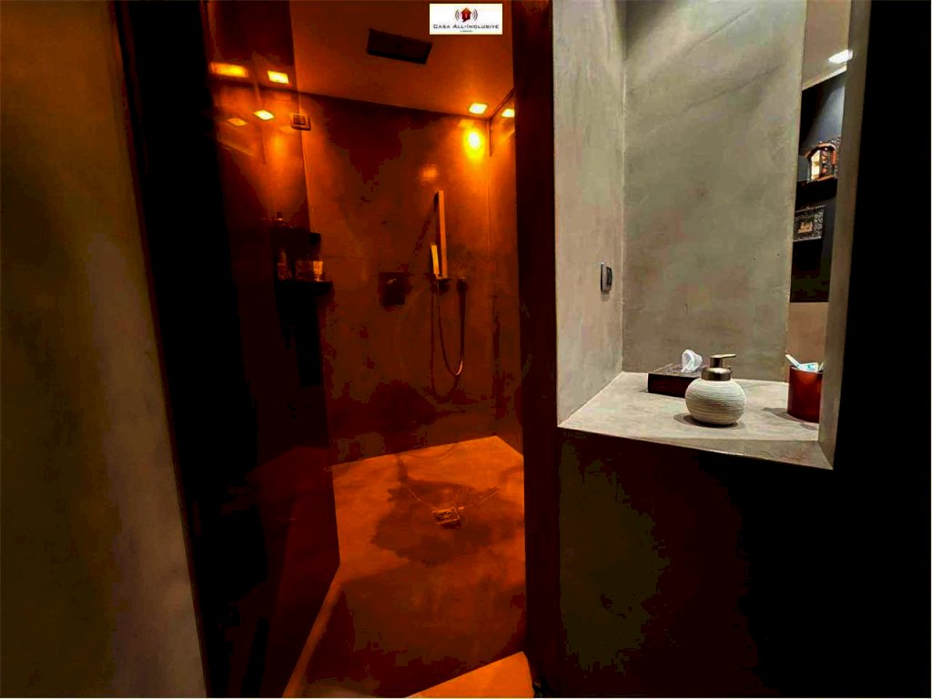 Il secondo bagno è rifinito con pareti in Pietra sanitari sospesi e un'ampia doccia;