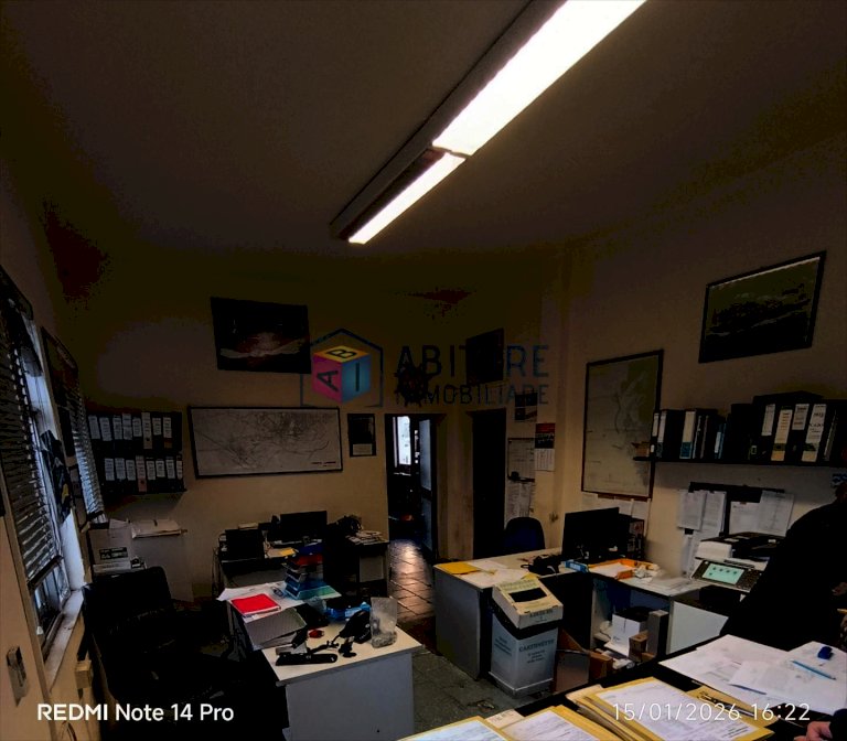 Locali uso ufficio così diviso, due grandi stanze, altre due stanze medie, due bagni, un locale adibito ad archivio. Piccolo piazzale antistante adibito a parcheggio, più locale esterno di sgombero.