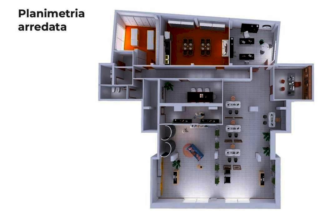 Gli spazi sono frazionabili fino a quattro uffici indipendenti, ciascuno con servizi, rendendo la soluzione estremamente flessibile.