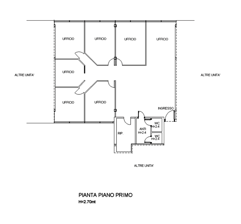 Ufficio e due posti auto coperti facente parte di un complesso per uffici situato in zona semicentrale di Mestre (VE) in viale Ancona, in prossimità della nuova sede universitaria di Ca' Foscari. L'unità comprende un locale di ingresso-ufficio, un disimpegno, sei uffici di cui uno che si affaccia su un cavedio, un locale archivio-ripostiglio e due servizi igienici dotati di antibagno.