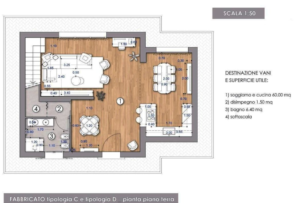La proprietà, in fase di ultimazione, si articola su due piani per una superficie totale di 140 mq e presenta la seguente suddivisione degli spazi: