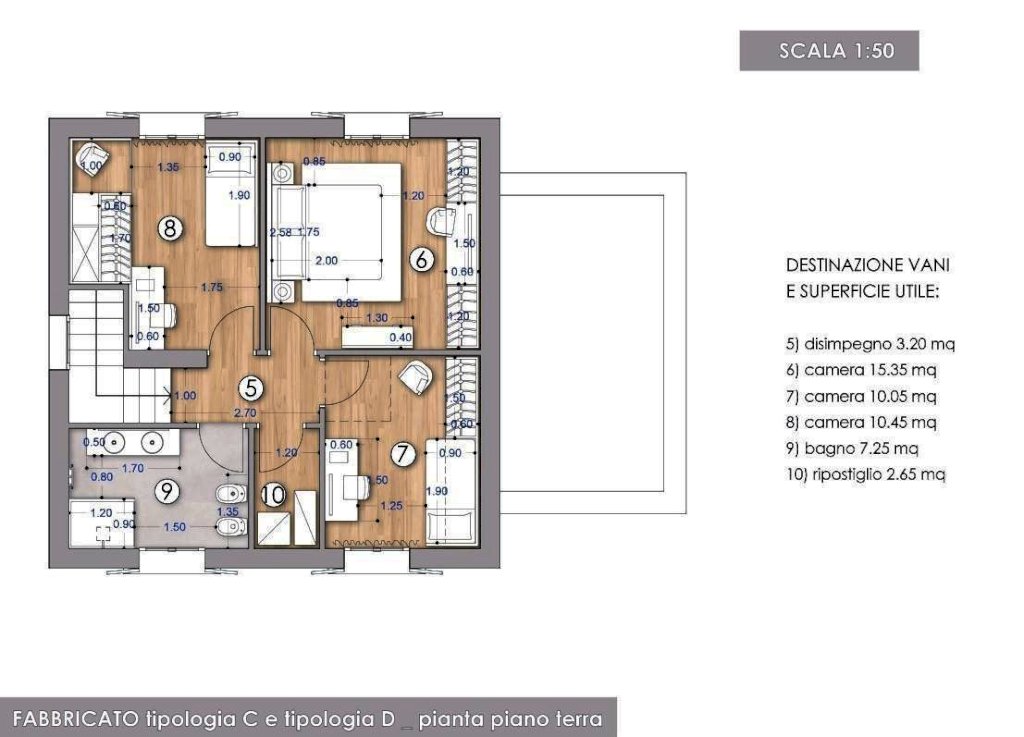 Al primo Piano disimpegno, camera matrimoniale, due camere singole, secondo bagno e ulteriore ripostiglio. Da qui, una scala retrattile conduce a una spaziosa soffitta utilizzabile come ripostiglio.