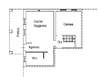 La prima unità, di dimensioni più contenute, si sviluppa al piano terra e nel sottotetto sul lato sud-ovest. È composta da un portico, una cucina-soggiorno, antibagno con w.c., una camera da letto e un ripostiglio al piano sottotetto, accessibile tramite una scaletta prefabbricata.