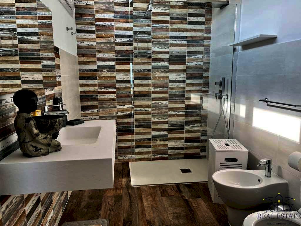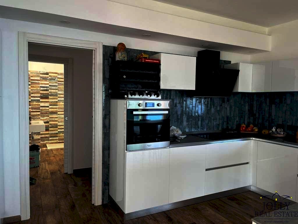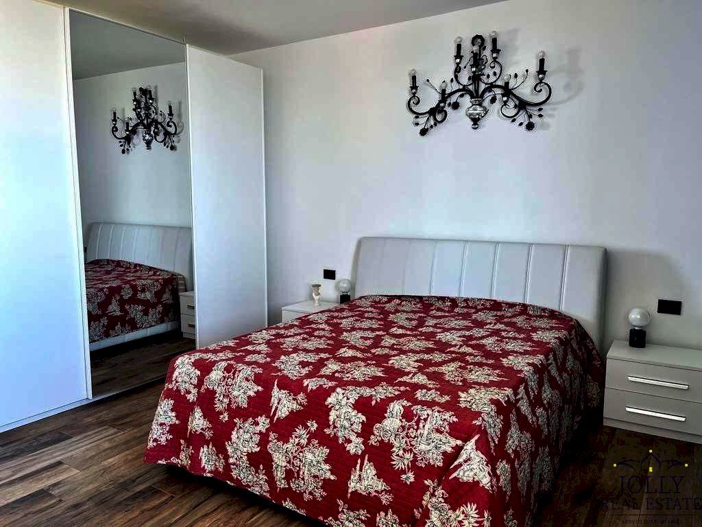 La zona abitativa principale, di circa 90 mq, si articola in un'ampia cucina con penisola integrata al soggiorno, entrambi immersi nella luce naturale grazie alle maestose porte-finestre che si aprono su una veranda panoramica. La camera da letto matrimoniale è anch'essa orientata verso il mare, regalando una continuità visiva che conferisce un senso di pace e armonia. Il bagno completa elegantemente il livello principale, che dispone inoltre di una seconda veranda collocata sull'ingresso, ideale come spazio di accoglienza.