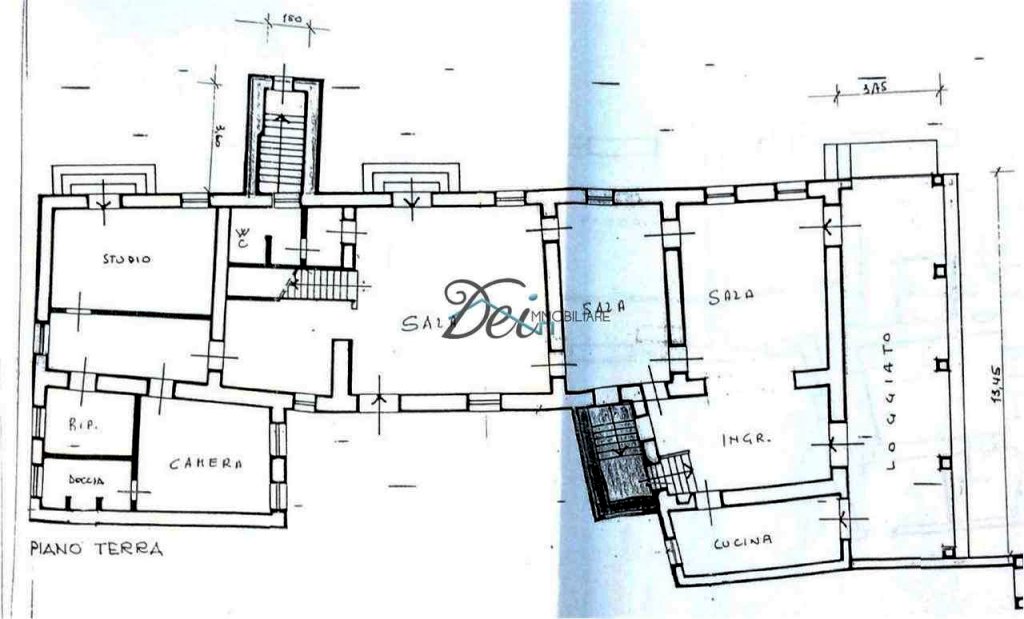 La villa ha una superficie di circa 800 mq ed è così suddivisa: PIANO TERRA: ingresso, 3 eleganti saloni con grandi camini in pietra, sala da pranzo con pregiato soffitto in legno e cotto, cucina con accesso al loggiato, due bagni, studio, camera matrimoniale con bagno privato e ripostiglio/lavanderia;