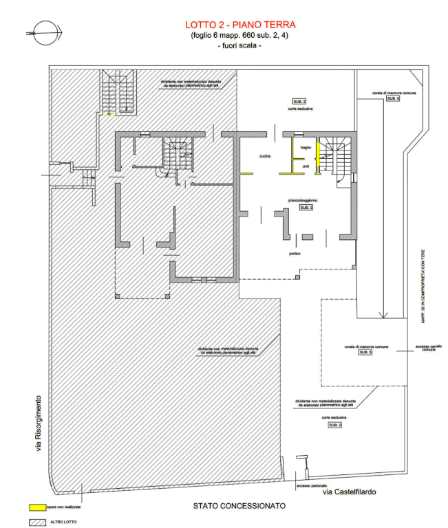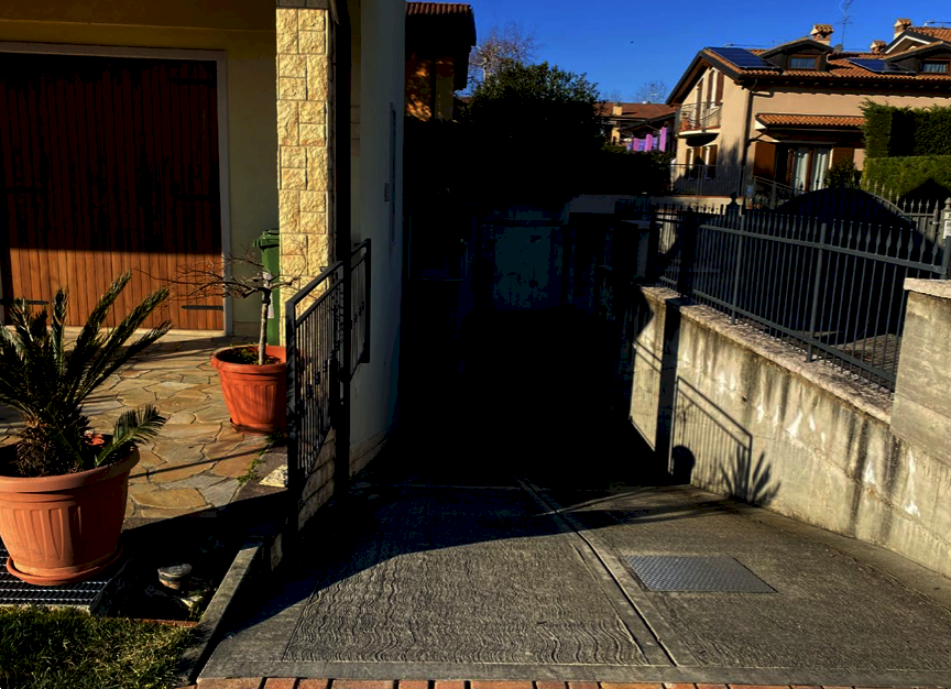 Porzione di villa bifamiliare al grezzo disposta su tre livelli con annessi portico e corti esclusive, oltre a pertinenziale autorimessa al piano interrato situata a Bussolengo (VR) in via Castelfidardo, per una superficie catastale complessiva di 203 metri quadri.