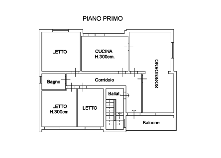 L'immobile è costituito da 8 vani e si sviluppa al primo piano di un edificio a due piani fuori terra, costituito da ingresso, balcone, soggiorno, cucina, corridoio, 3 stanze da letto e un bagno, oltre a due aree cortive esclusive.