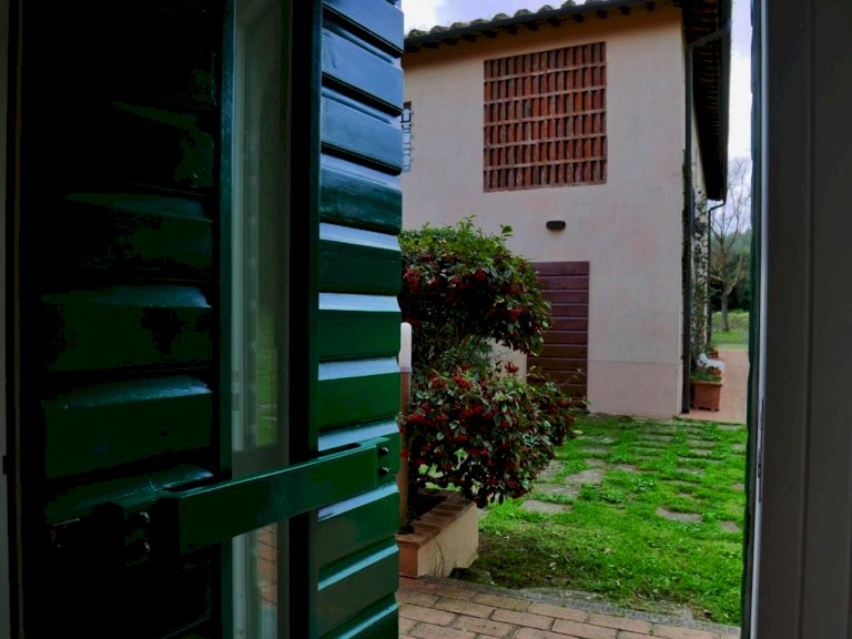 Sul lato esposto a sud e con accesso soggiorno e cucina troviamo il giardino di pertinenza alla colonica, arredato con struttura in legno perfettamente comunicante con la cucina.