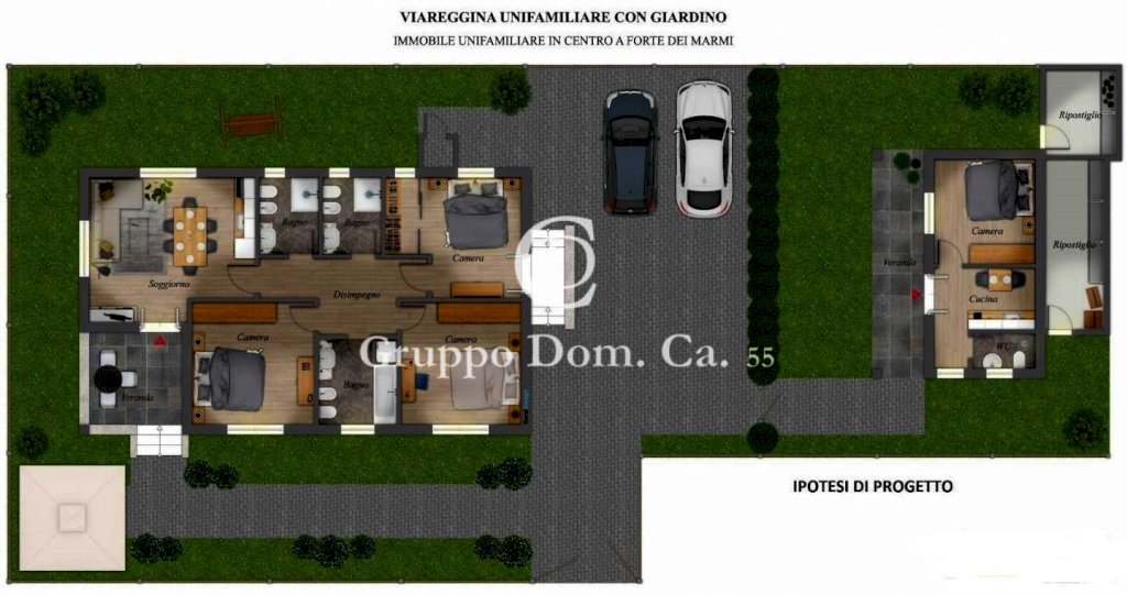 In posizione semicentrale a Forte dei Marmi, a pochi passi dal centro e in una strada riservata e di prestigio, si vende una villetta singola degli anni '60 su un terreno di circa 400 mq.