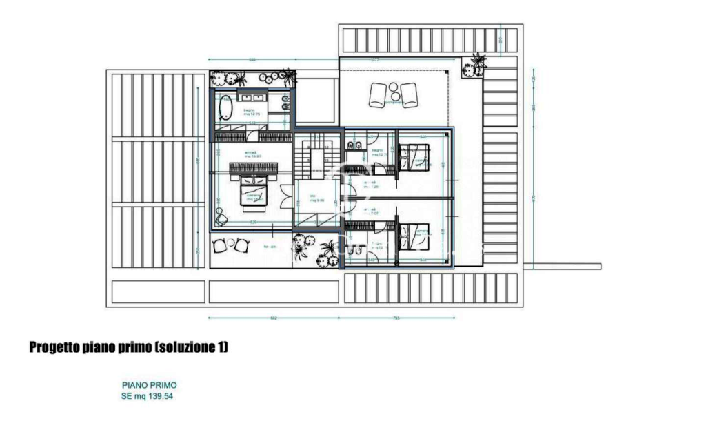 Piano primo: due camere matrimoniali con bagno privato e terrazza, oltre a camera padronale con bagno en suite, cabina armadio e terrazza.