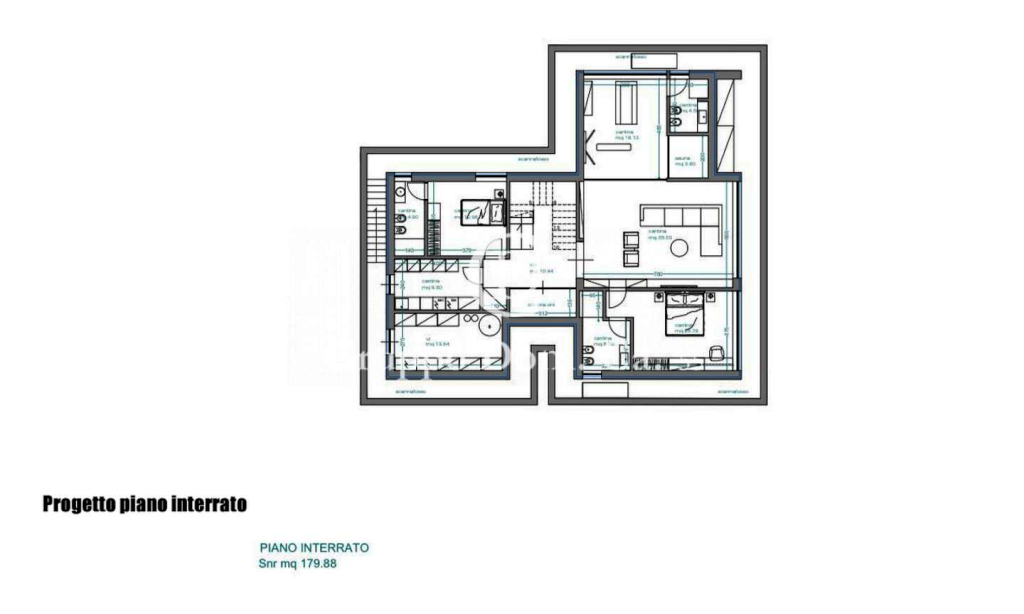 Piano interrato: soggiorno, cucina, due camere con bagno, lavanderia e area spa con bagno.