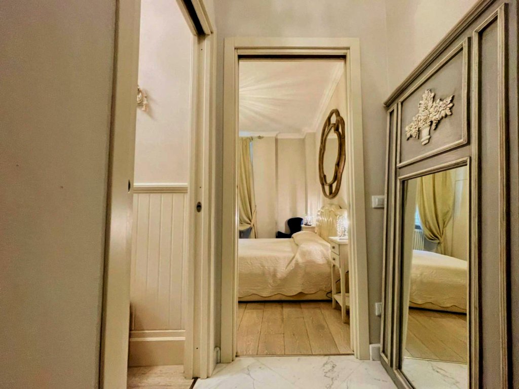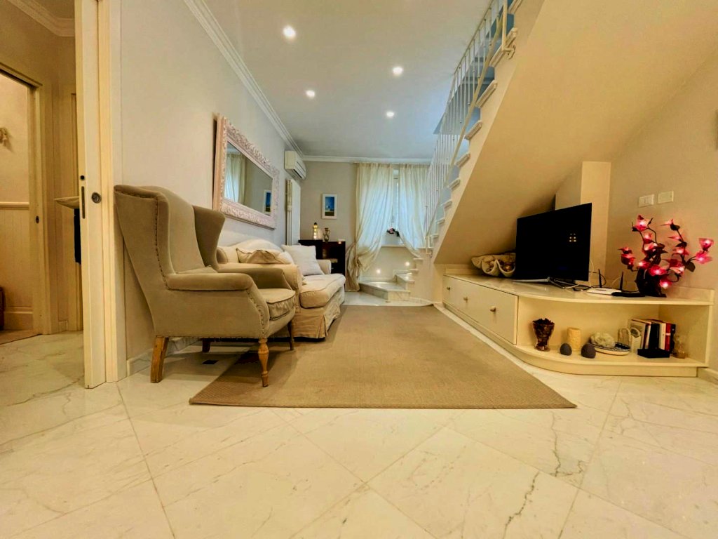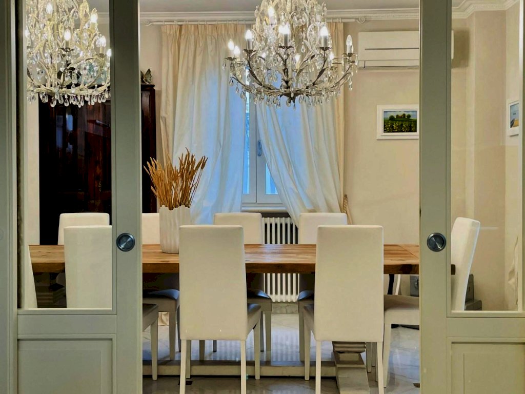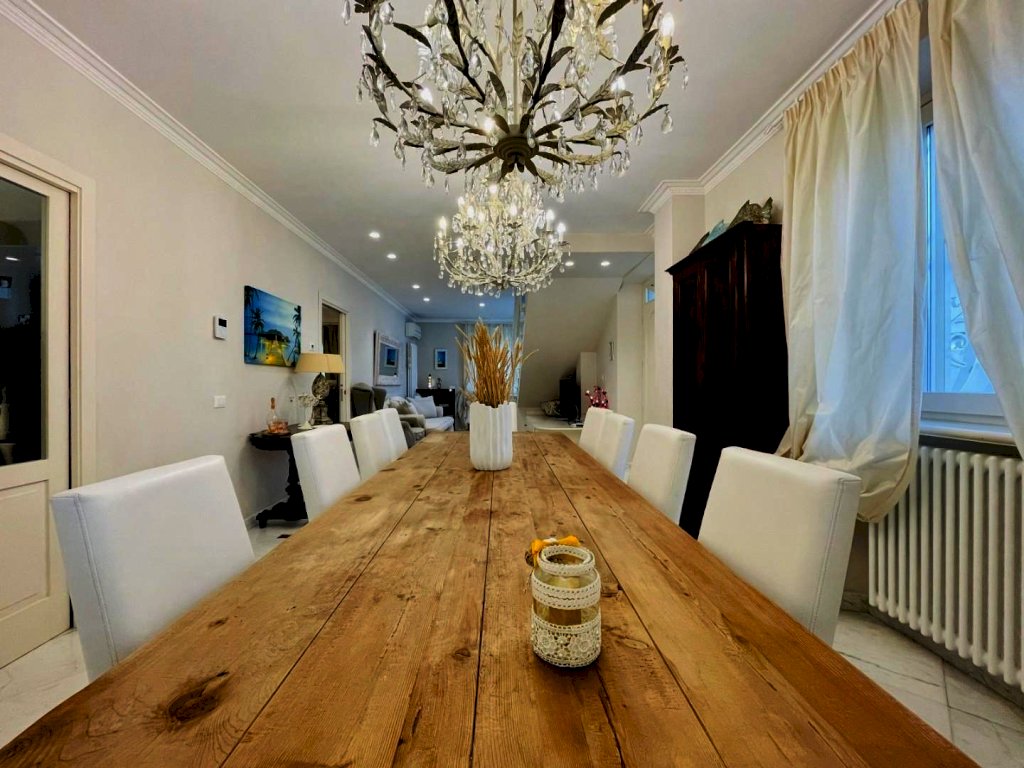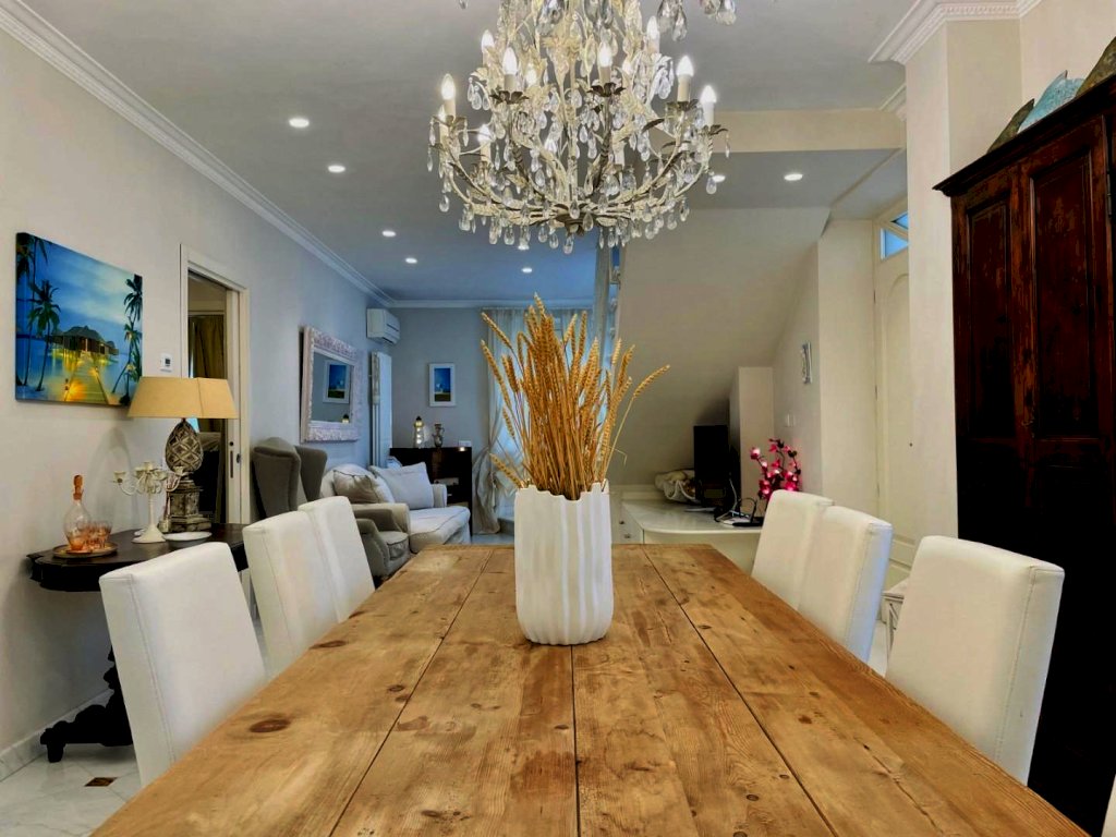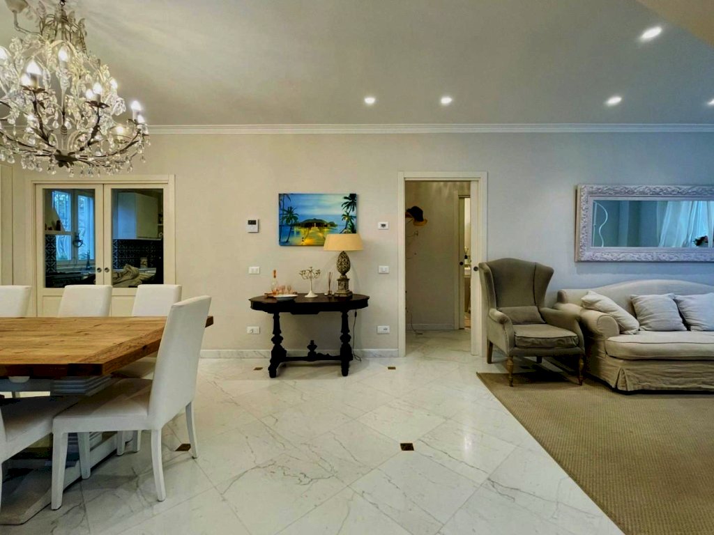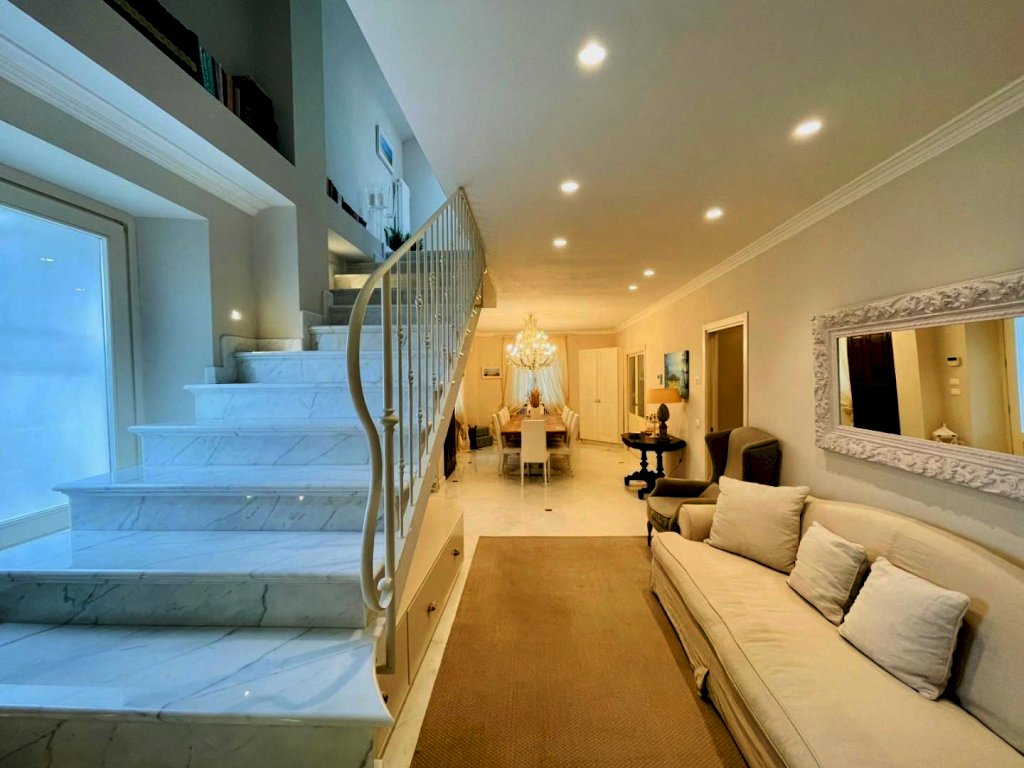 L'ingresso avviene nella zona giorno, Questo generoso ambiente, arredato pregevolmente e studiato nei dettagli fonde perfettamente il convivio con l'eleganza, così come il resto dell'abitazione.