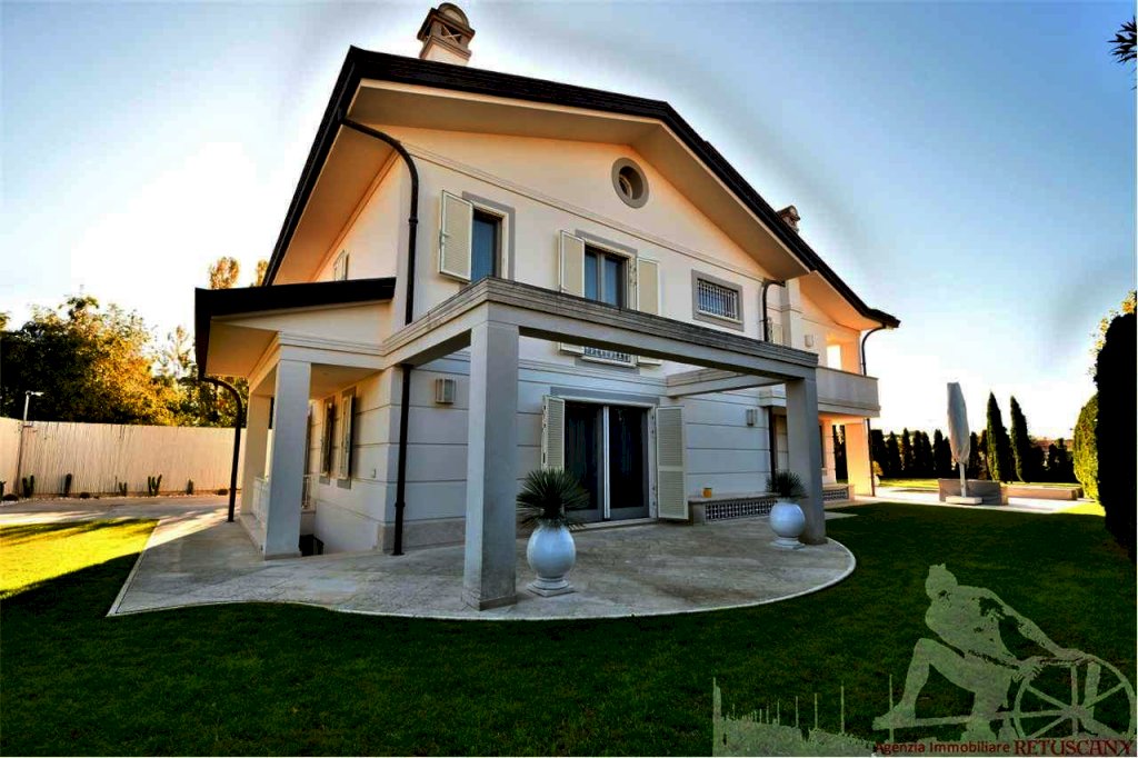 Villa singola distribuita su due piani fuori terra oltre al sottotetto in parte fruibile e all'interrato, con mini-piscina idromassaggio e posti auto interni alla proprietà. Abitazione di circa 270 mq (commerciali circa 360 mq), lotto di circa 1100 mq, distanza dal mare circa 1.400 metri. Al piano terra: ingresso, soggiorno con portico, pranzo con portico, cucina abitabile, ripostiglio, bagno di servizio, disimpegno. Al piano primo: camera padronale con vano armadi bagno e terrazza coperta, camera matrimoniale con bagno e vano armadi, camera matrimoniale con bagno e balcone, disimpegno. Al piano sottotetto: studio e spazi soffitta. Al piano interrato: taverna, cucinotto, camera con bagno, lavanderia, centrale termica, w.c. con anti, disimpegno, accesso anche dall'esterno. Con ascensore di collegamento tra tutti i piani.