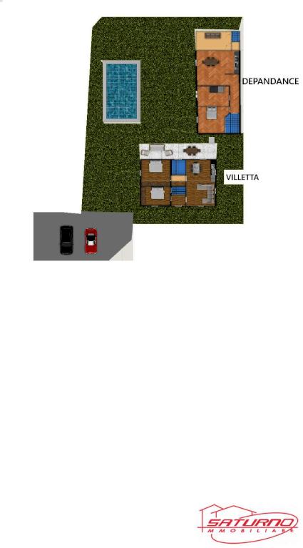 Nel giardino, affacciata anch' essa sulla piscina , troviamo la depandance utizzata di fatto come una seconda abitazione vera e propria, sviluppata per circa 90 mq anch'essa al solo piano terra, con tetto a vista in legno lamellare sbiancato, e si compone di ingresso/soggiorno con angolo cottura da cui scendendo due gradini troviamo una graziosa sala tv con ampie vetrate verso la piscina, poi troviamo il disimpegno notte, con cameretta, camera matrimoniale e bagno.Il tutto ristrutturato comppletamente solo 5 anni fa.Dotata di riscaldamento a pavimento a gas metano, aria condizionata, infissi in legno con doppi vetri