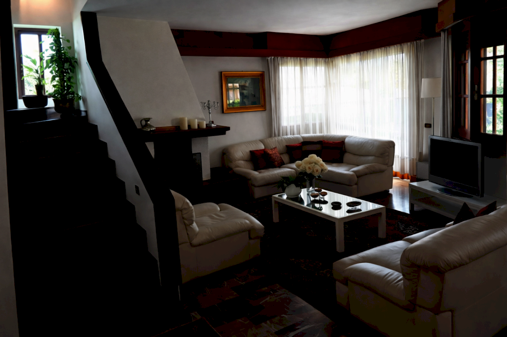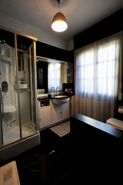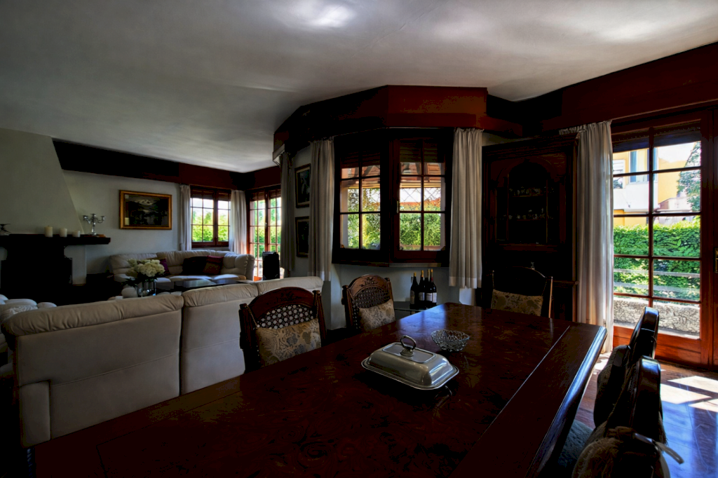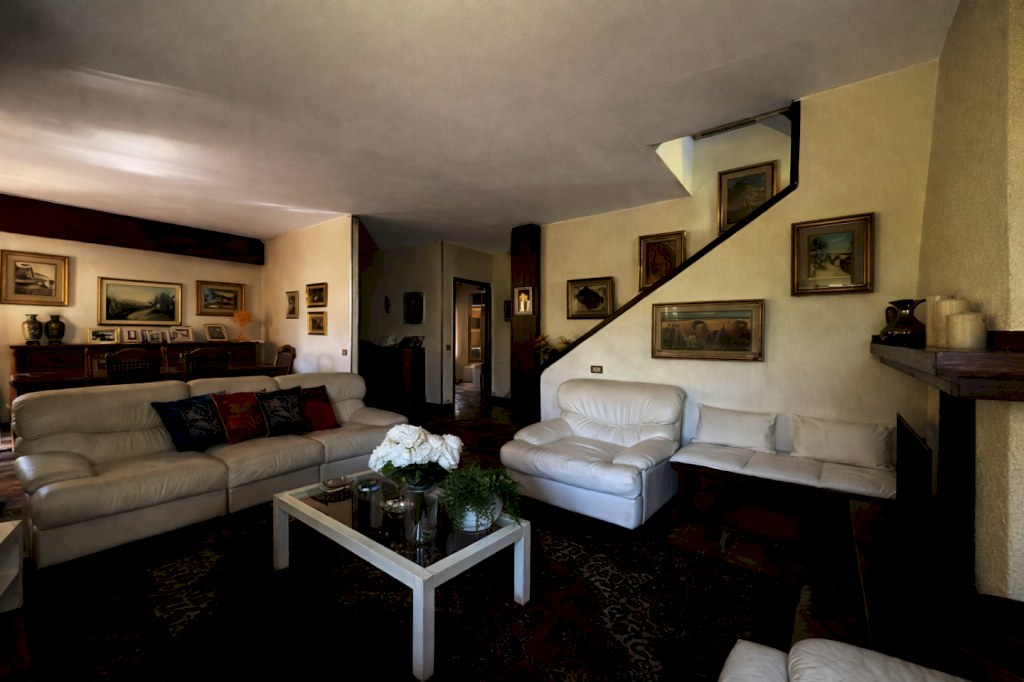 Al piano superiore un luminoso disimpegno consente l'accesso alle quattro camere da letto e ai due bagni. Sono presenti ben quattro terrazze nella zona notte. Il piano semi interrato è accessibile sia dall'interno della casa che da scala esterna ed è diviso in tre locali uso cantina ed una lavanderia. All'esterno la proprietà possiede una zona dedicata al parcheggio di più automobili ed una zona a giardino.