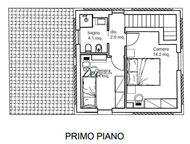 Primo Piano: disimpegno, camera matrimoniale, camera singola e bagno con doccia.