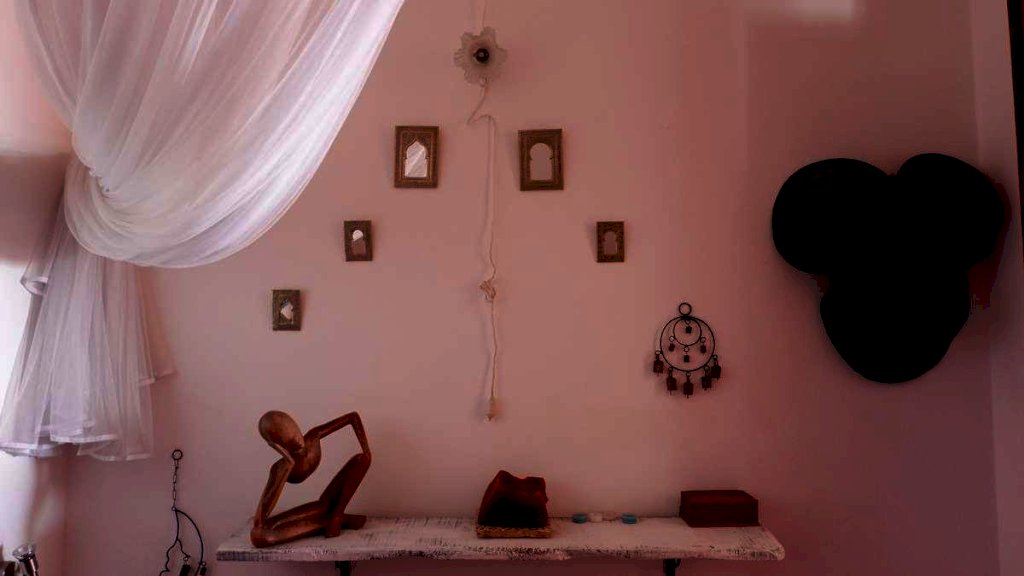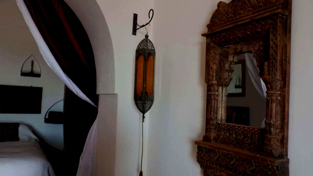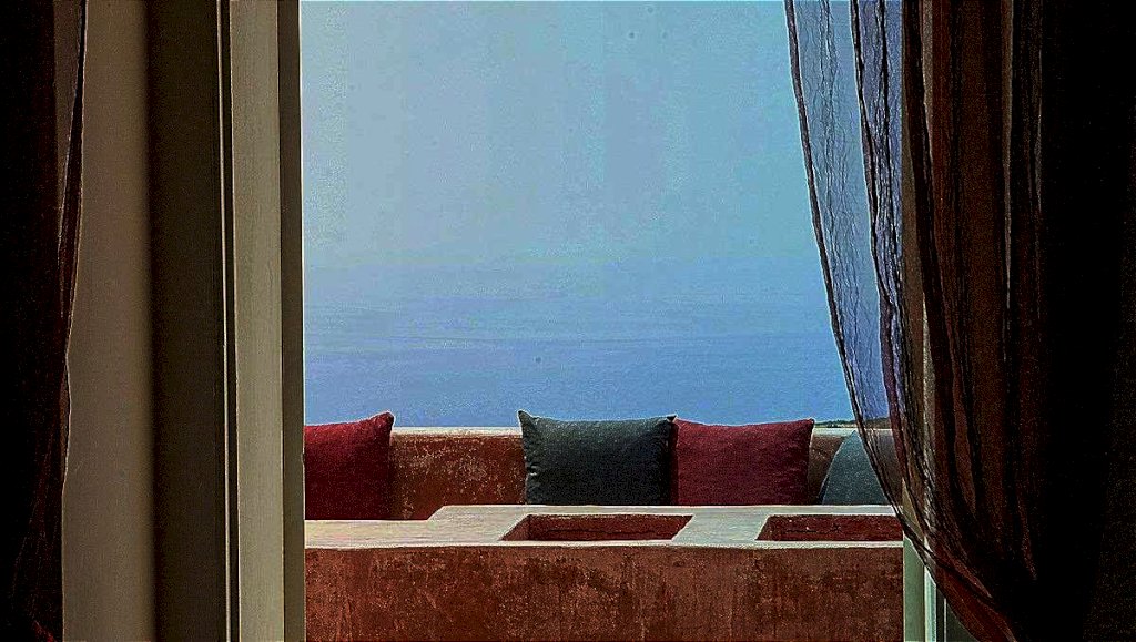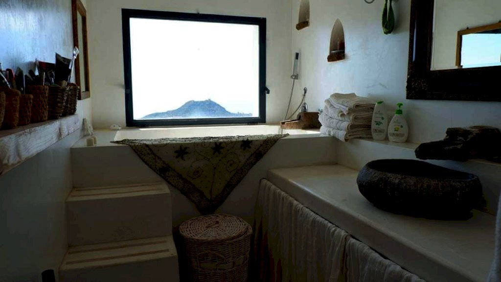 Dalla prima porta si accede al soggiorno con angolo cucina ed al primo bagno. Questo con una grande vasca sulla quale si trova una finestra che come un quadro incornicia il panorama sul mare.