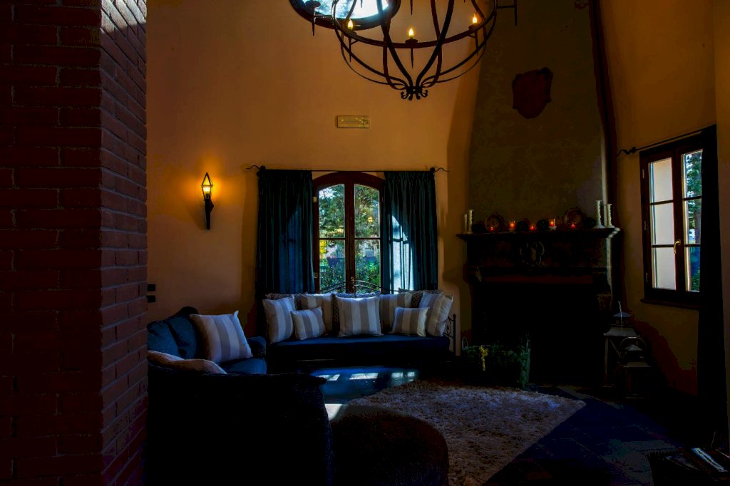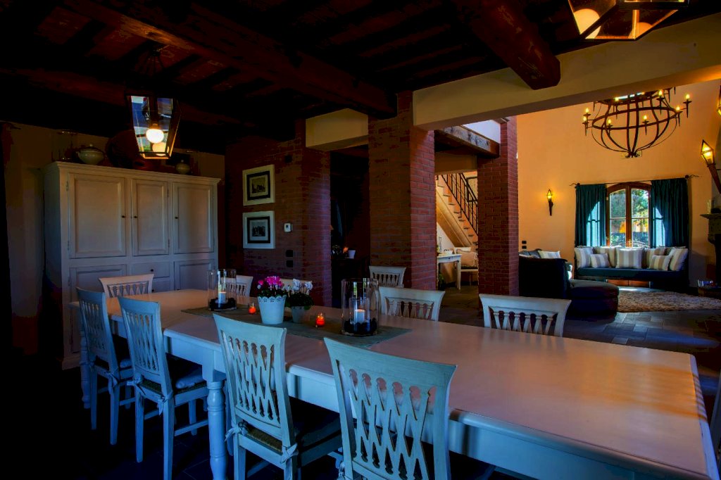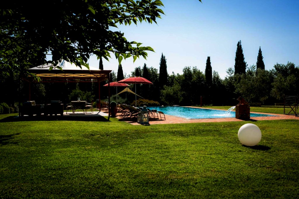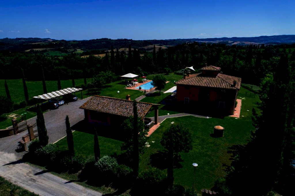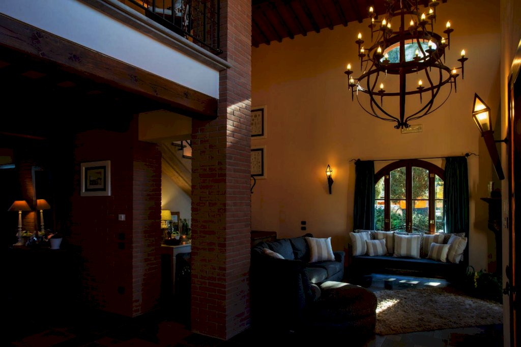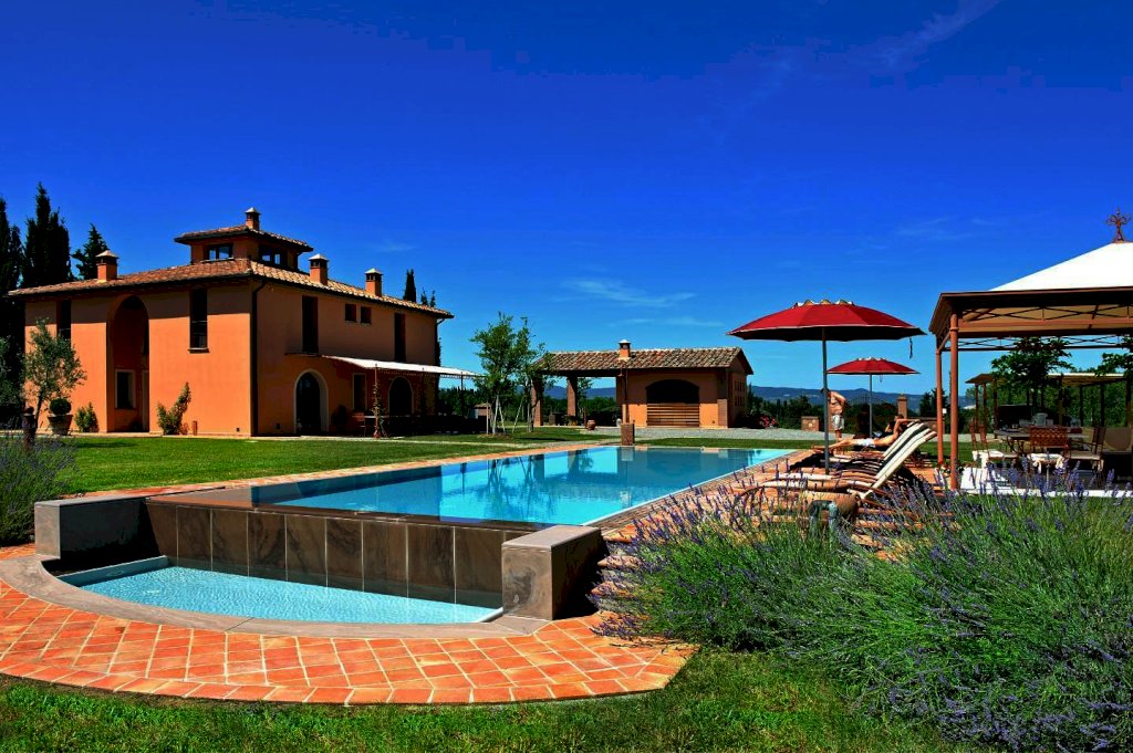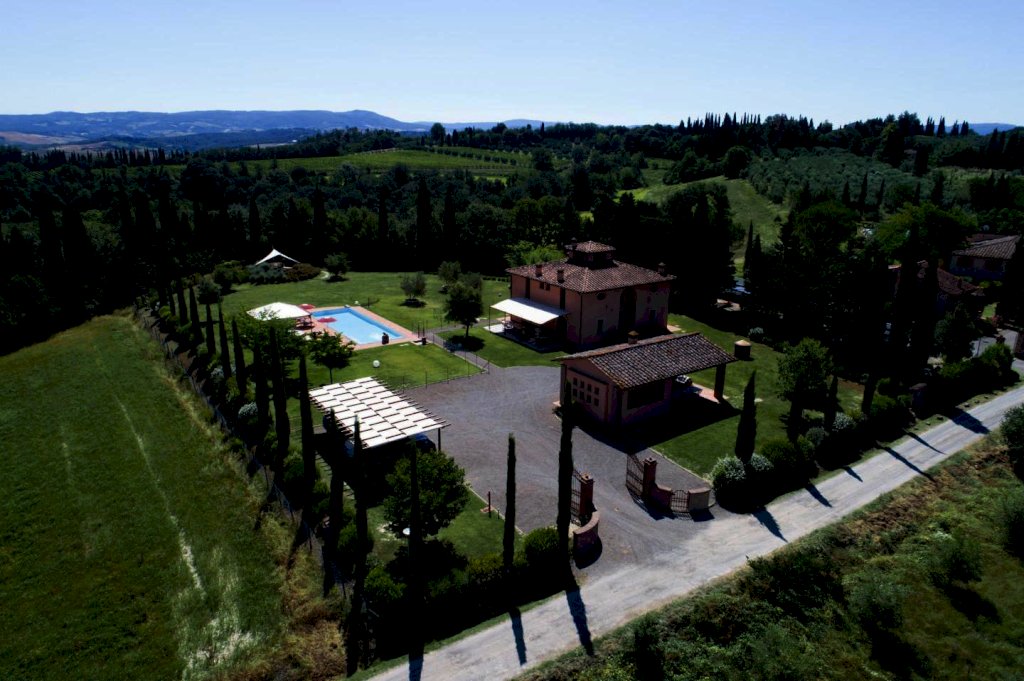 una scala a chiocciola porta alla "piccionaia", una tipica torretta posta al centro del tetto, trasformata in un locale con poltrone dal quale si gode una vista panoramica sulle colline a 360°. Tornando al piano terra la cucina e il soggiorno si aprono all'esterno su un pergolato. Tutta la villa è, inoltre, dotata di un impianto di riscaldamento da terra e aria condizionata, regolabili in modo indipendente da ogni vano, filodiffusione, allarme, cassaforte e telefono e comodo parcheggio coperto per auto. Una piccola dependance in stile rustico, aperta su 3 lati e attrezzata per poter cucinare, fare un barbecue o rilassarsi, una piscina di 15 m. x 5 m. profonda da 150 a 40 cm. con ingresso a scala romana, zona idromassaggio lombare e cervicale comandata da pulsanti pneumatici, a bordo sfioratore su 3 lati, mentre sul lato rimanente una piccola cascata dà sulla parte della piscina dedicata ai bambini, dove l'acqua è alta solo 40 cm; un solarium con lettini, sedie e piccoli tavoli per gli amanti del sole; un gazebo in ferro battuto con divani e poltrone per coloro che preferiscono l'ombra. Tutto attorno un ampio giardino di 5.000 mq. con la tipica flora toscana, recinzione con cancello elettrico e siepi di arbusti mediterranei proteggeranno la vostra privacy.