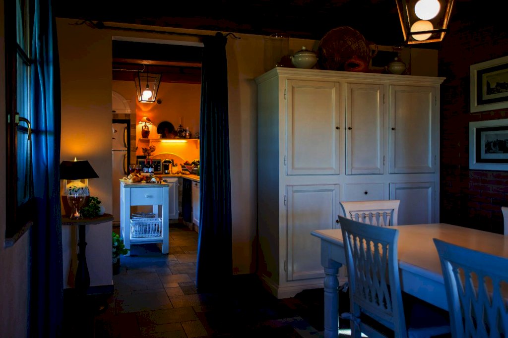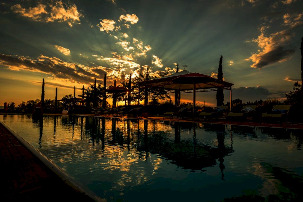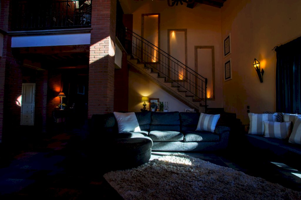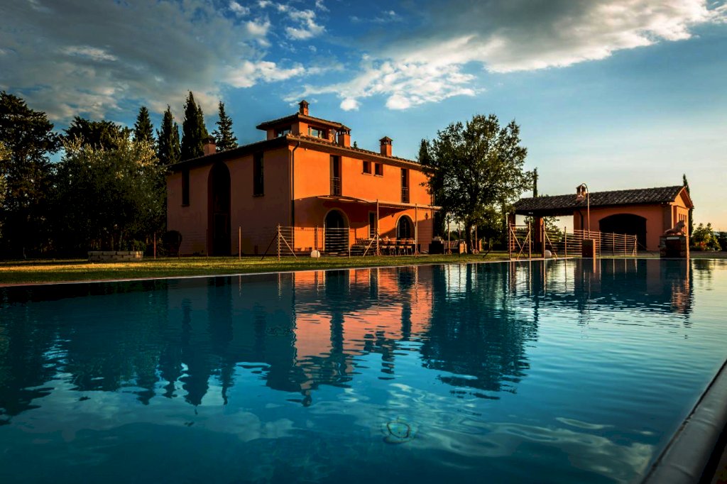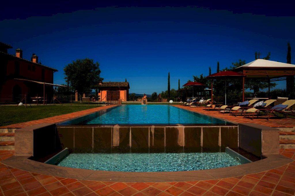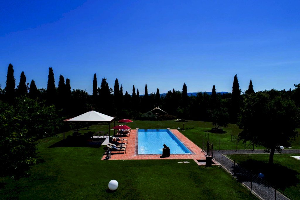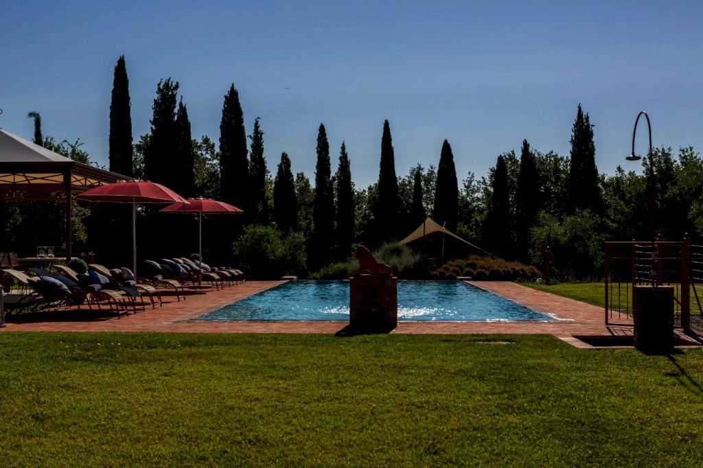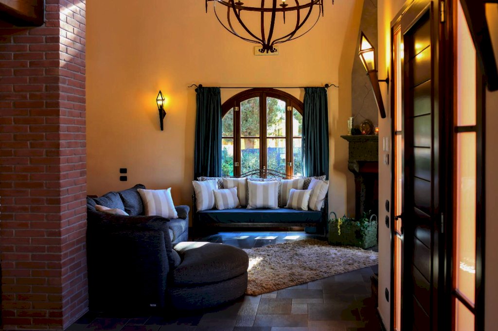 una scala a chiocciola porta alla "piccionaia", una tipica torretta posta al centro del tetto, trasformata in un locale con poltrone dal quale si gode una vista panoramica sulle colline a 360°. Tornando al piano terra la cucina e il soggiorno si aprono all'esterno su un pergolato. Tutta la villa è, inoltre, dotata di un impianto di riscaldamento da terra e aria condizionata, regolabili in modo indipendente da ogni vano, filodiffusione, allarme, cassaforte e telefono e comodo parcheggio coperto per auto. Una piccola dependance in stile rustico, aperta su 3 lati e attrezzata per poter cucinare, fare un barbecue o rilassarsi, una piscina di 15 m. x 5 m. profonda da 150 a 40 cm. con ingresso a scala romana, zona idromassaggio lombare e cervicale comandata da pulsanti pneumatici, a bordo sfioratore su 3 lati, mentre sul lato rimanente una piccola cascata dà sulla parte della piscina dedicata ai bambini, dove l'acqua è alta solo 40 cm; un solarium con lettini, sedie e piccoli tavoli per gli amanti del sole; un gazebo in ferro battuto con divani e poltrone per coloro che preferiscono l'ombra. Tutto attorno un ampio giardino di 5.000 mq. con la tipica flora toscana, recinzione con cancello elettrico e siepi di arbusti mediterranei proteggeranno la vostra privacy.