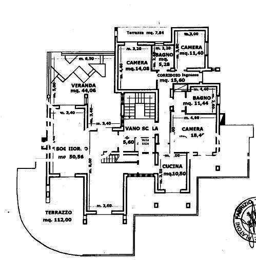 Il piano primo cui si accede dalla scala interna proveniente dal piano sottostante e da un ingresso autonomo è suddiviso in: vano scala anche per l'accesso al piano superiore, soggiorno, tre camere, due bagni di cui uno con sauna, corridoio, cucina, per una superficie di mq. 162,86, una veranda di mq. 44,06, una terrazza semiperimetrale di mq. 119,84=.