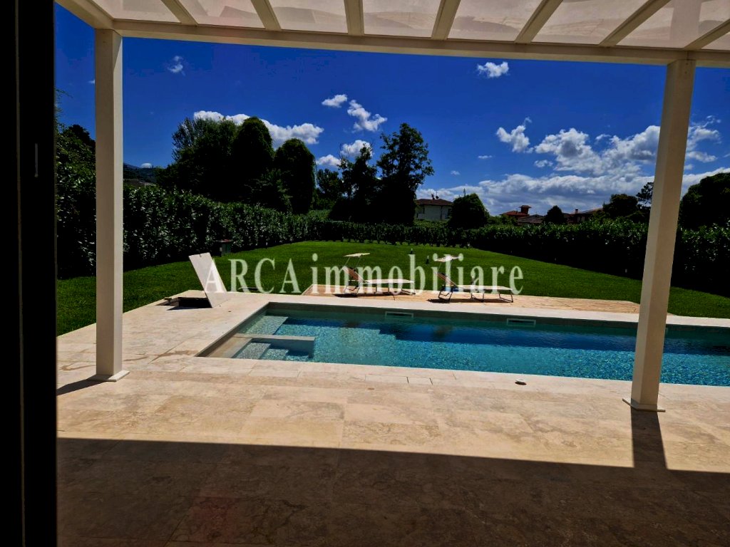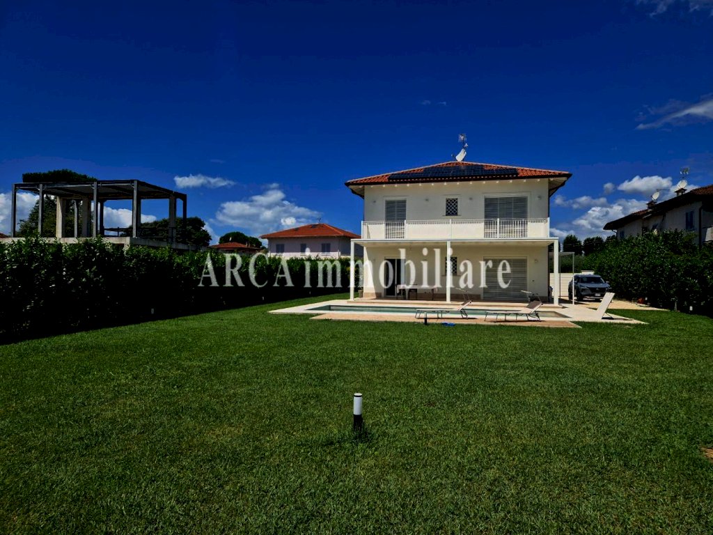 PIETRASANTA, si vende in zona residenziale Villa di Nuova Costruzione disposta su 2 livelli e composta da soggiorno, cucina con affaccio su una grande pompeiana, bagno e camera matrimoniale al piano terra, 3 camere matrimoniali con bagno privato e balconi si trovano al primo piano.