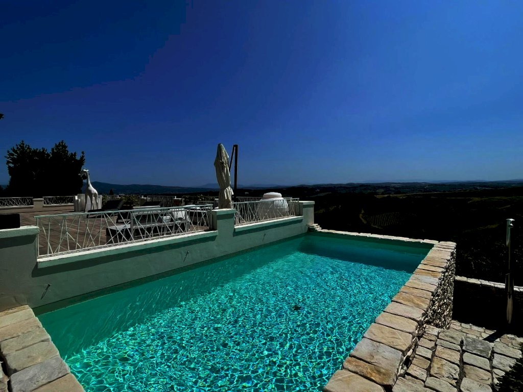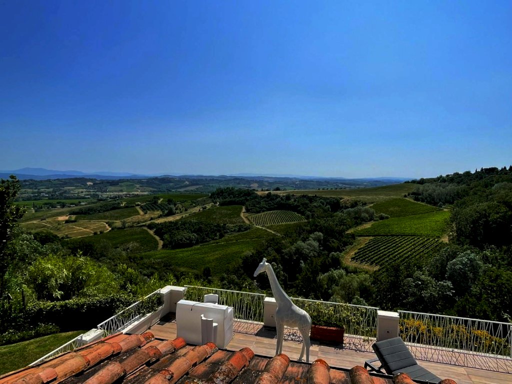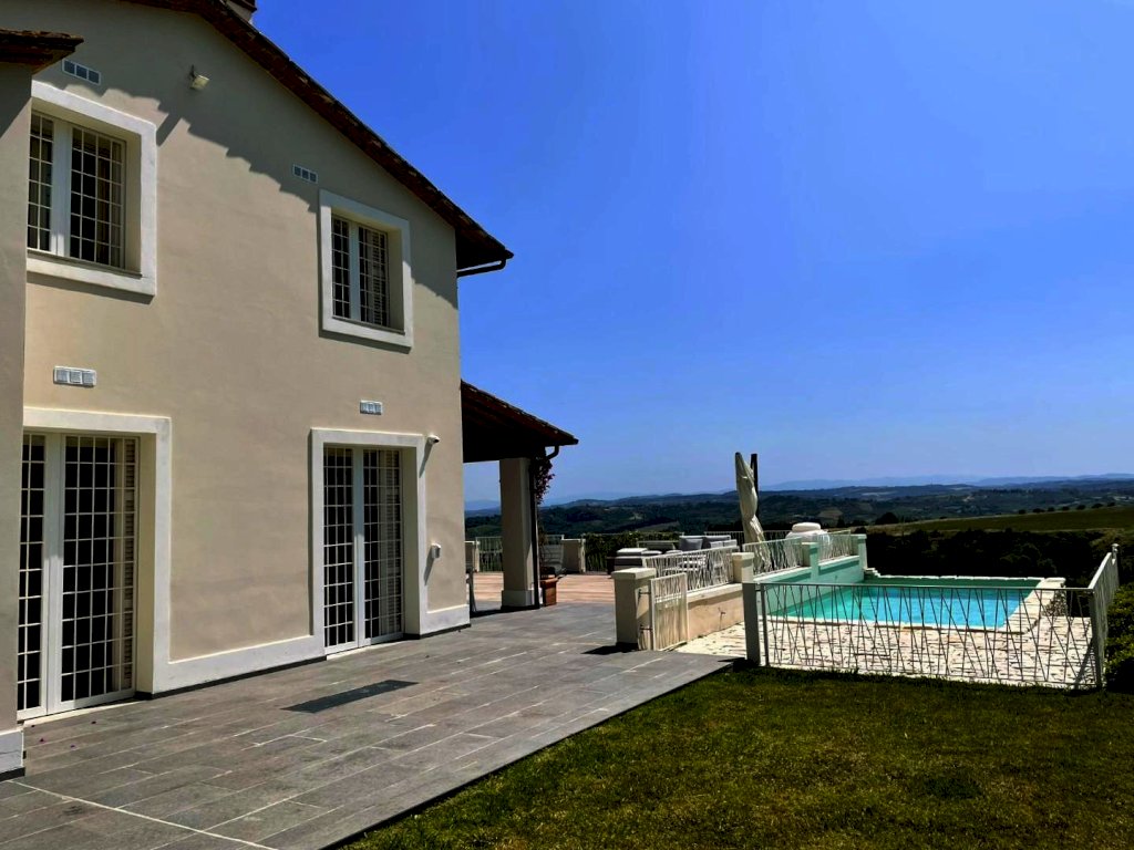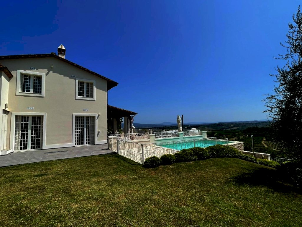Splendida villa con piscina (ex fabbricato colonico) finemente ristrutturata, in posizione dominante con vista a 360° che spazia dalle montagne alle colline della campagna toscana a sud di San Miniato. L'immobile, corredato di un ettaro di terreno, in parte a giardini, si sviluppa su tre piani. L’ingresso principale, situato al piano terra, immette in una zona studio che conduce a un ampio living articolato tra soggiorno e sala da pranzo, connessa a una spaziosa cucina abitabile. Tutti gli ambienti della zona giorno si aprono sul giardino circostante oltre che su un'ampia terrazza, di circa 200 mq., con loggiato e piscina panoramica. Sempre in prossimità dell’ingresso si trovano il bagno di servizio, accessibile tramite disimpegno, e un'elegante scala in pietra serena che permette di raggiungere sia il piano superiore che il seminterrato. Il piano superiore, ricavato nel sottotetto, ospita la zona notte composta da una camera matrimoniale con bagno privato e antibagno adibito a cabina armadio, una camera doppia, una terza camera attualmente adibita a guardaroba e un secondo bagno. Al piano seminterrato si trova un'ampia taverna con angolo attrezzato a sauna, un bagno con doccia, una cucina, un ripostiglio, la lavanderia e un locale accessorio da cui si accede al garage di circa 27 mq.