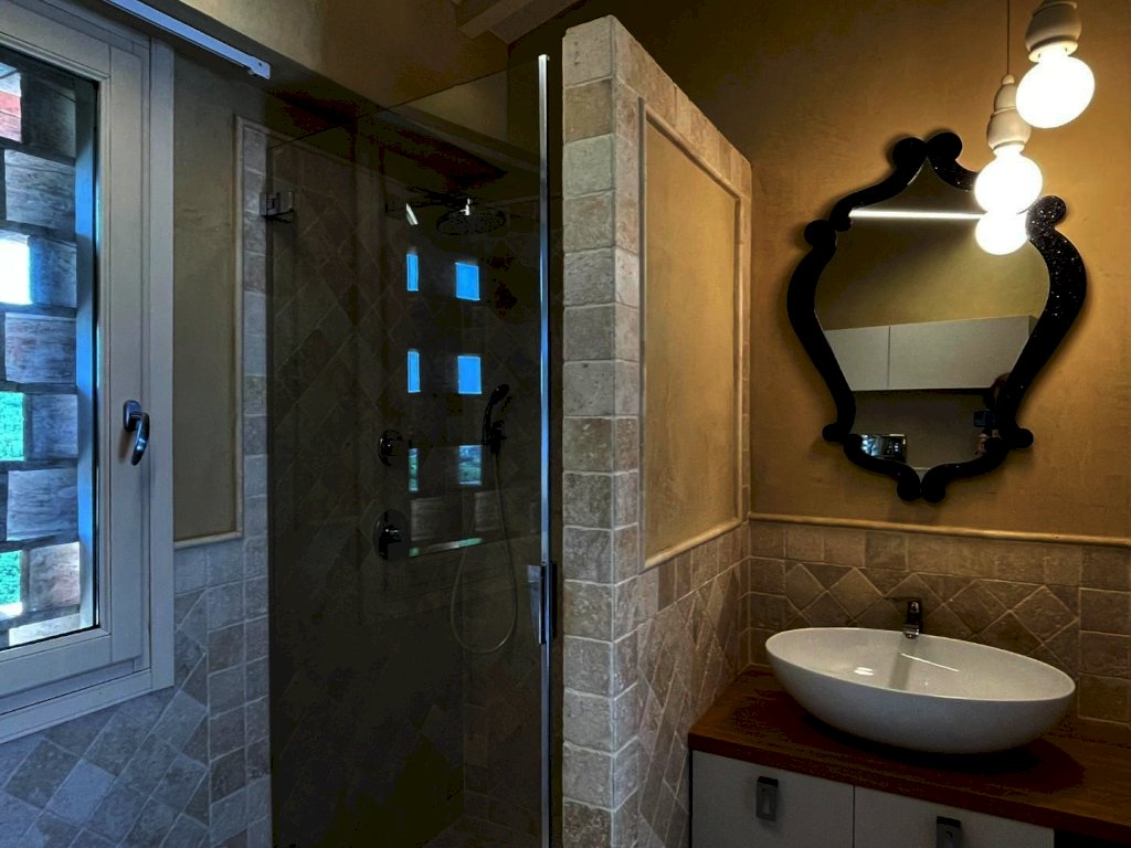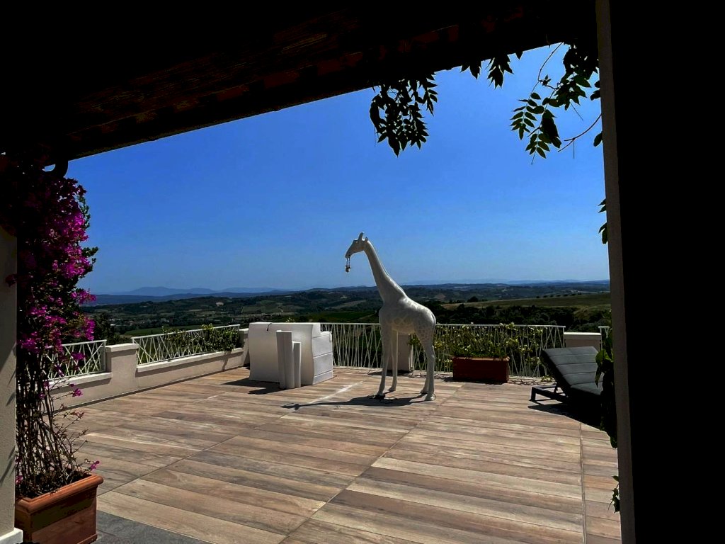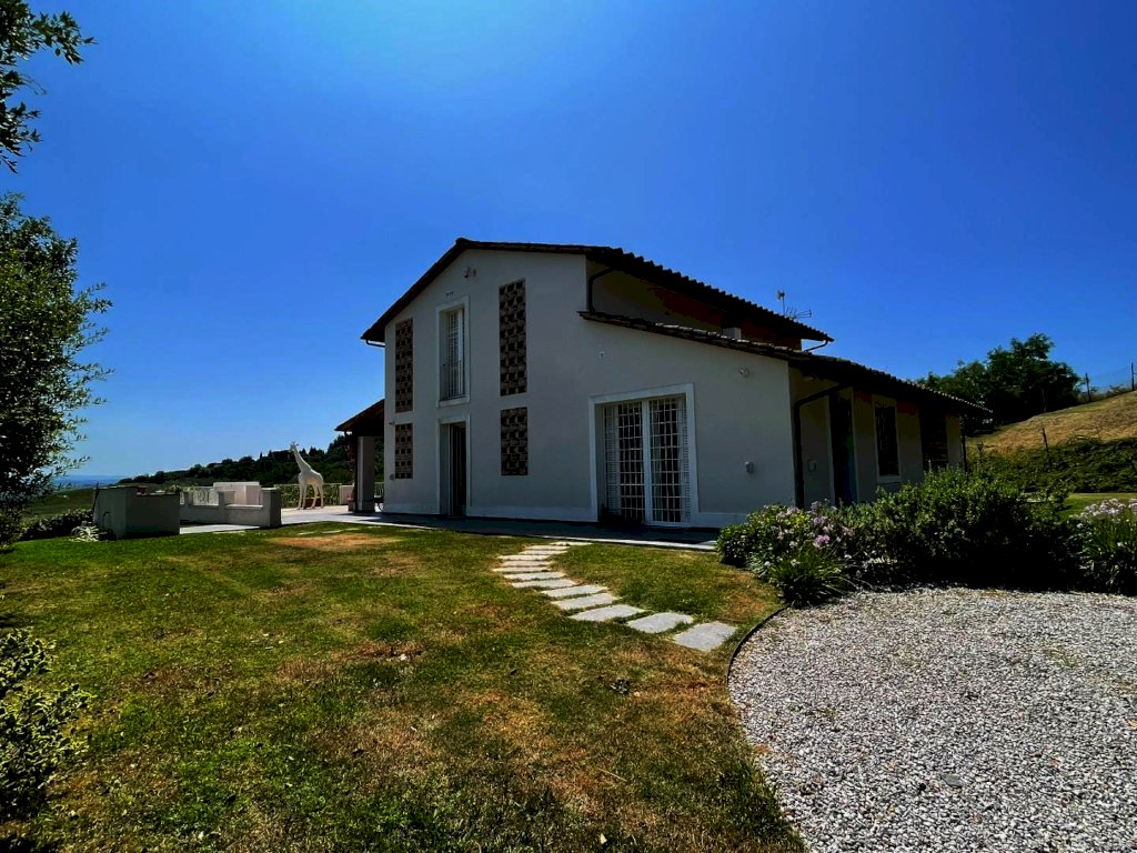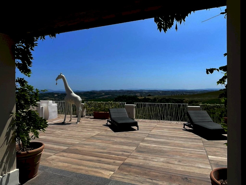 Splendida villa con piscina (ex fabbricato colonico) finemente ristrutturata, in posizione dominante con vista a 360° che spazia dalle montagne alle colline della campagna toscana a sud di San Miniato. L'immobile, corredato di un ettaro di terreno, in parte a giardini, si sviluppa su tre piani. L’ingresso principale, situato al piano terra, immette in una zona studio che conduce a un ampio living articolato tra soggiorno e sala da pranzo, connessa a una spaziosa cucina abitabile. Tutti gli ambienti della zona giorno si aprono sul giardino circostante oltre che su un'ampia terrazza, di circa 200 mq., con loggiato e piscina panoramica. Sempre in prossimità dell’ingresso si trovano il bagno di servizio, accessibile tramite disimpegno, e un'elegante scala in pietra serena che permette di raggiungere sia il piano superiore che il seminterrato. Il piano superiore, ricavato nel sottotetto, ospita la zona notte composta da una camera matrimoniale con bagno privato e antibagno adibito a cabina armadio, una camera doppia, una terza camera attualmente adibita a guardaroba e un secondo bagno. Al piano seminterrato si trova un'ampia taverna con angolo attrezzato a sauna, un bagno con doccia, una cucina, un ripostiglio, la lavanderia e un locale accessorio da cui si accede al garage di circa 27 mq.