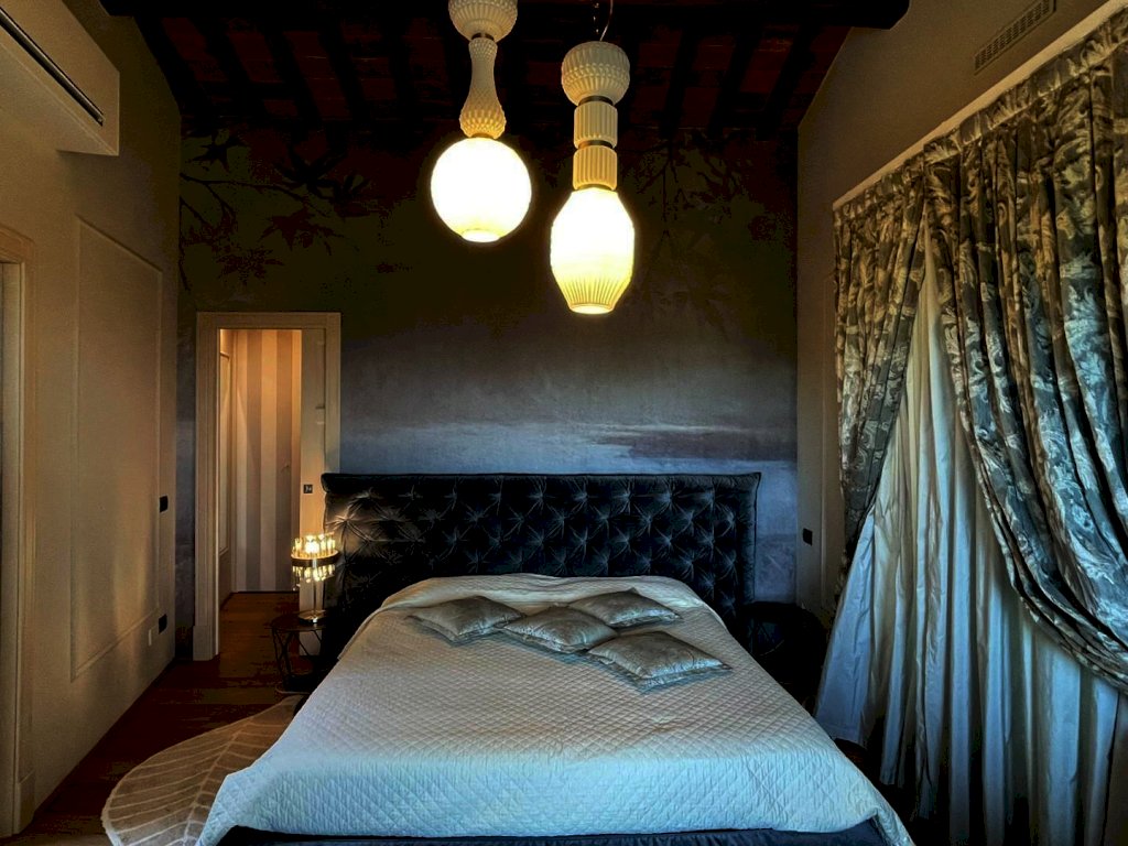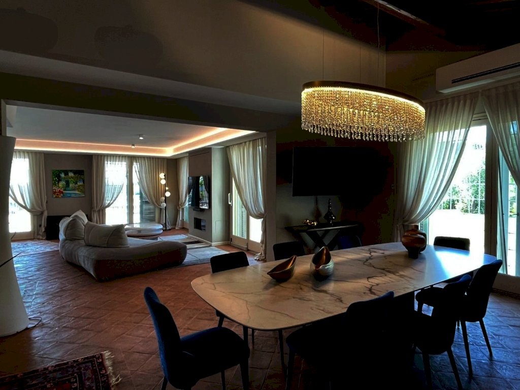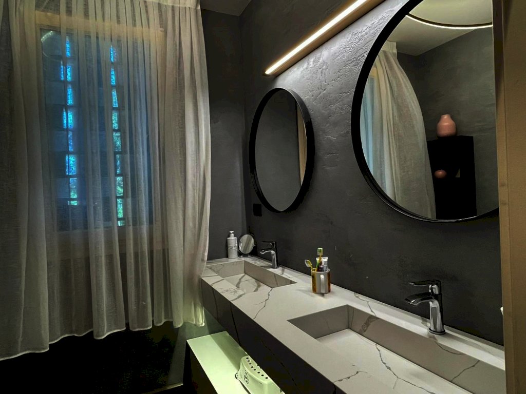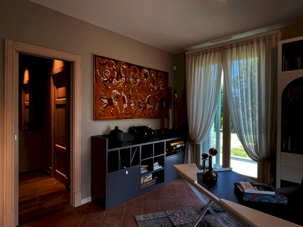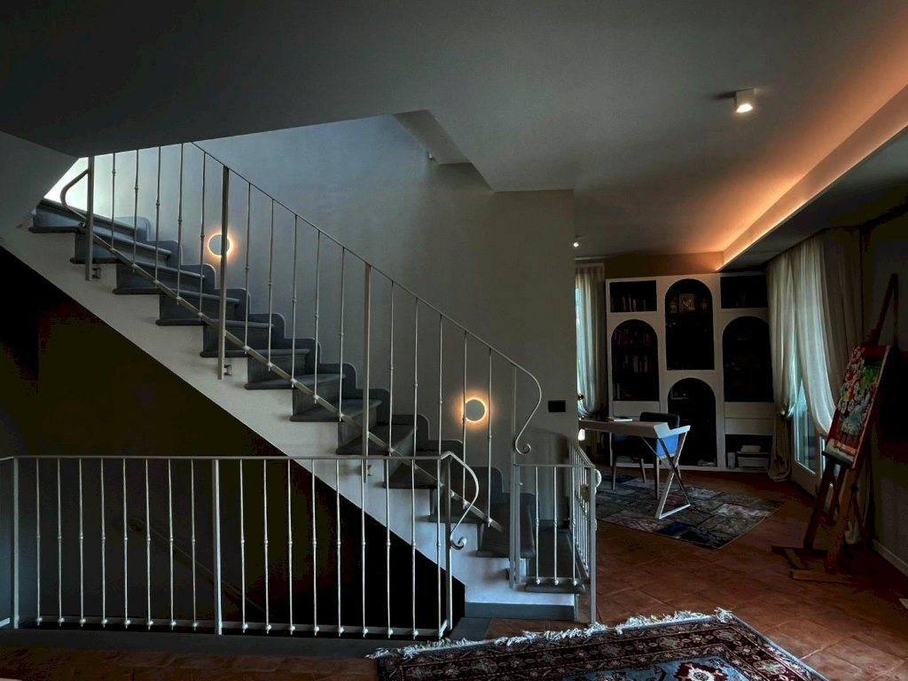 The main entrance, located on the ground floor, opens onto a study area that leads to a spacious living area, arranged between a sitting room and dining room, connected to a large kitchen with space for dining. All rooms in the living area open onto the surrounding garden as well as to a large terrace of approximately 200 sqm, with a loggia and panoramic swimming pool. Also near the entrance there are a guest bathroom, accessed through a small passage, and an elegant pietra serena staircase leading to both the upper floor and the basement level. The upper floor, located in the attic space, hosts the sleeping area, consisting of a master bedroom with en-suite bathroom and a walk-in closet, a twin bedroom, a third bedroom currently used as a wardrobe, and a second bathroom.