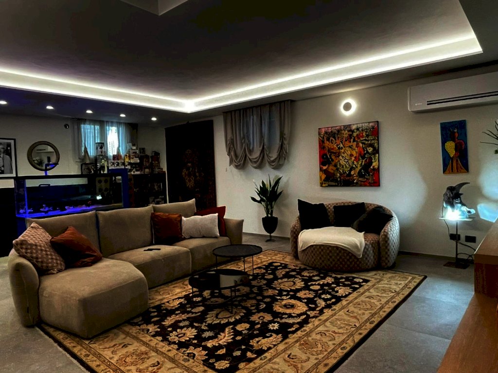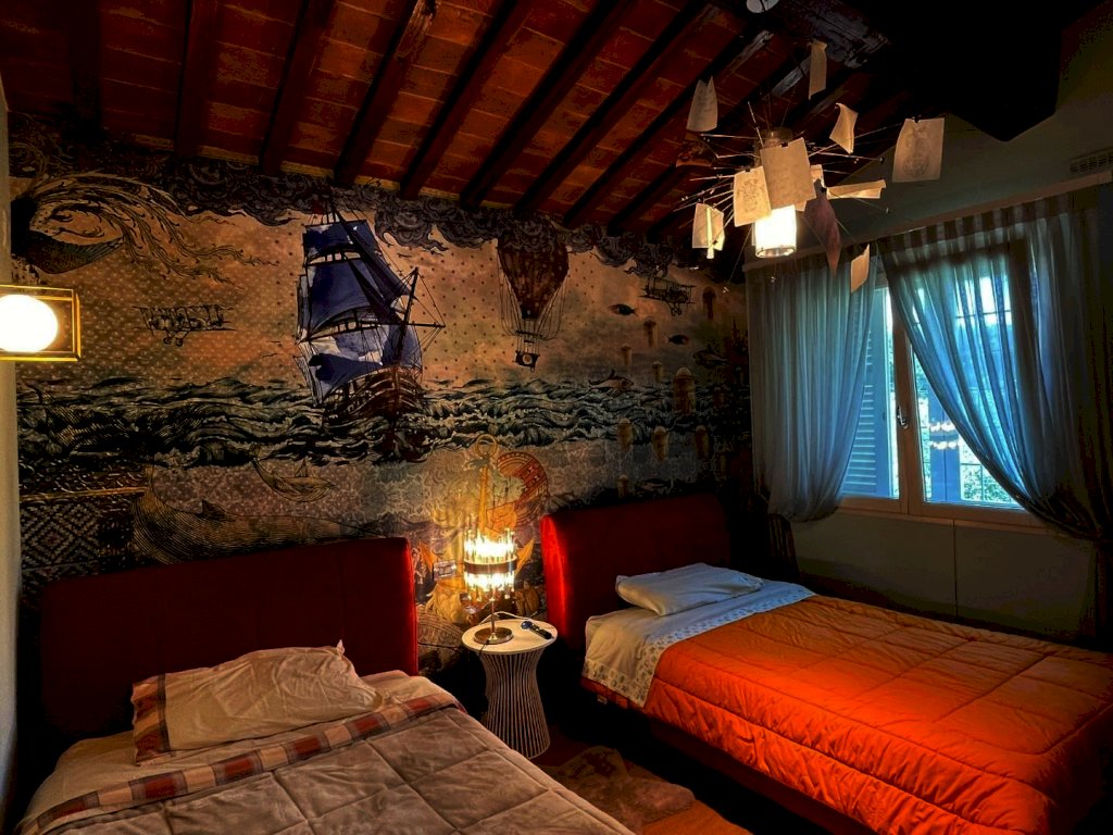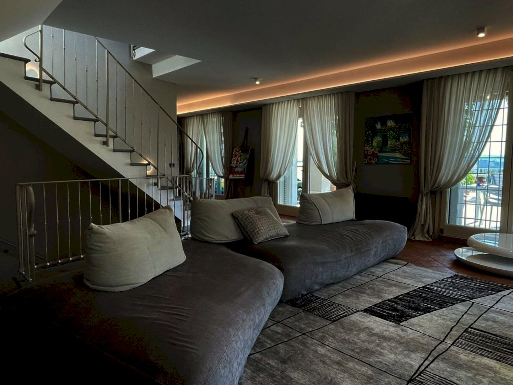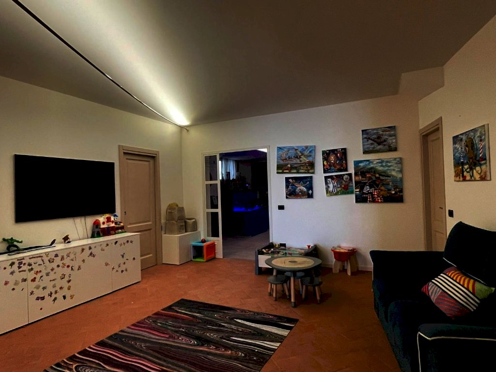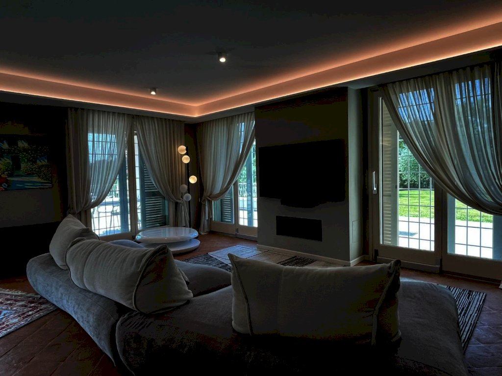 The main entrance, located on the ground floor, opens onto a study area that leads to a spacious living area, arranged between a sitting room and dining room, connected to a large kitchen with space for dining. All rooms in the living area open onto the surrounding garden as well as to a large terrace of approximately 200 sqm, with a loggia and panoramic swimming pool. Also near the entrance there are a guest bathroom, accessed through a small passage, and an elegant pietra serena staircase leading to both the upper floor and the basement level. The upper floor, located in the attic space, hosts the sleeping area, consisting of a master bedroom with en-suite bathroom and a walk-in closet, a twin bedroom, a third bedroom currently used as a wardrobe, and a second bathroom.