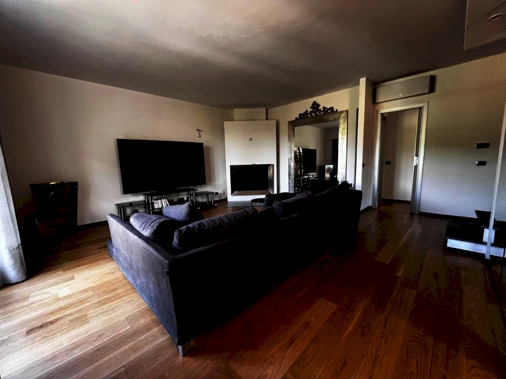 Spaziosa sala living molto luminosa grazie alle ampie vetrate, impreziosita da un elegante camino a legna perfettamente funzionante che integra l’impianto di riscaldamento. Cucina a vista moderna e ben distribuita, due camere da letto e un secondo bagno.
