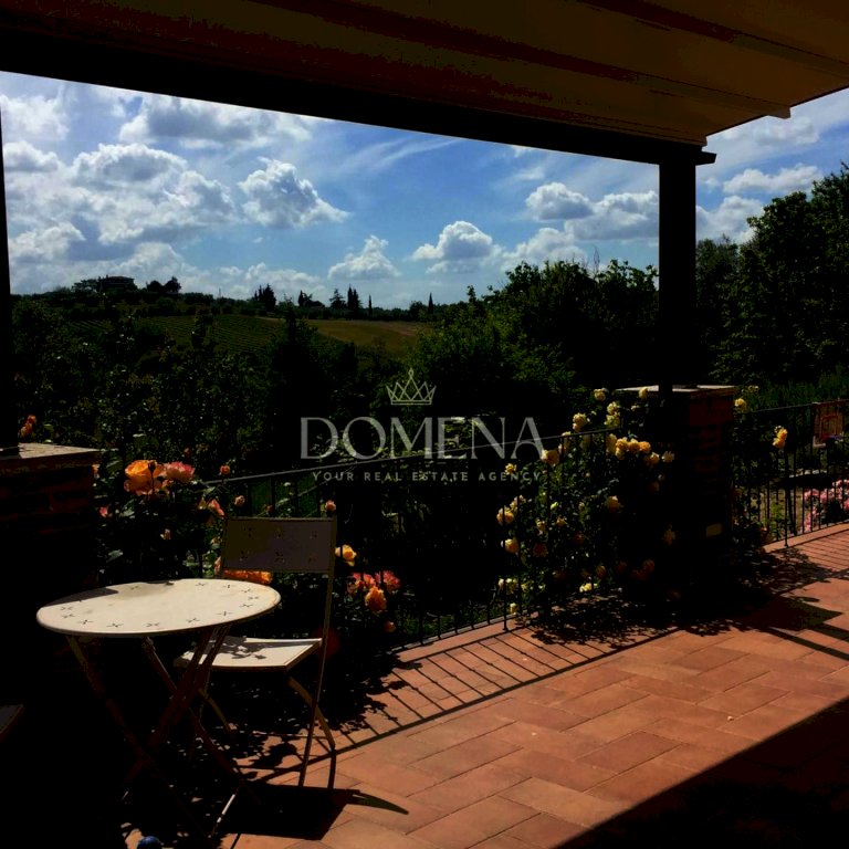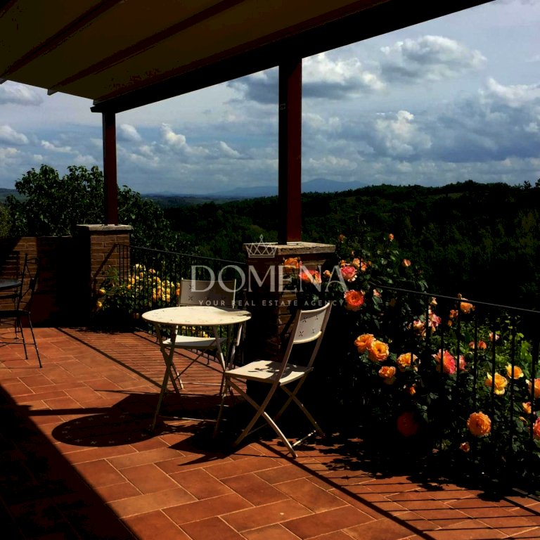 In piccolo complesso immerso nel verde in pozione unica e dominante su tutta la vallata e a soli 8 minuti da Siena, villetta singola libera sui 4 lati in perfette condizioni in stile tipico toscano a pietra di 187 mq composta da ingresso, soggiorno con termocamino, cucina abitabile, ripostiglio, disimpegno con studio o camerina, lavanderia, ripostiglio e bagno. Al piano superiore 2 camere doppie, bel bagno finestrato con vasca, altra camera matrimoniale con bagno interno, soffitto in travi e travicelli. Dalla zona giorno si accede direttamente al terrazzo di 90 mq con copertura tramite tenda elettrica.