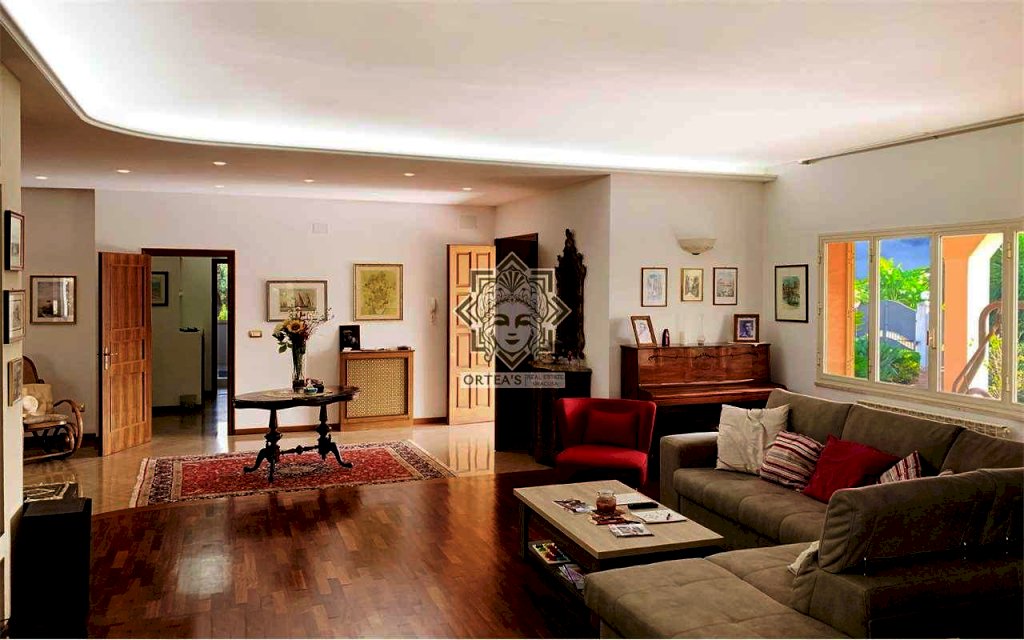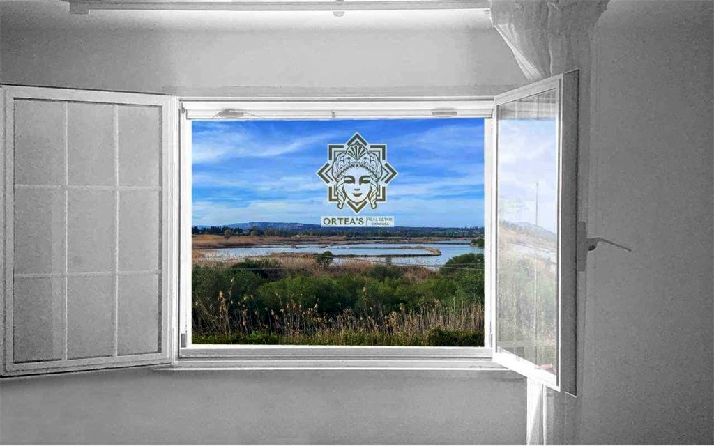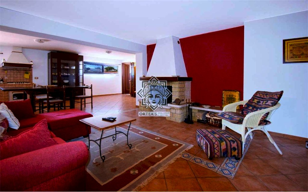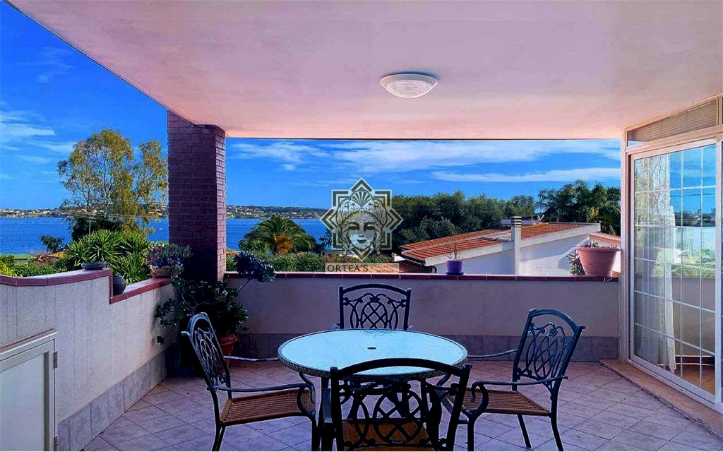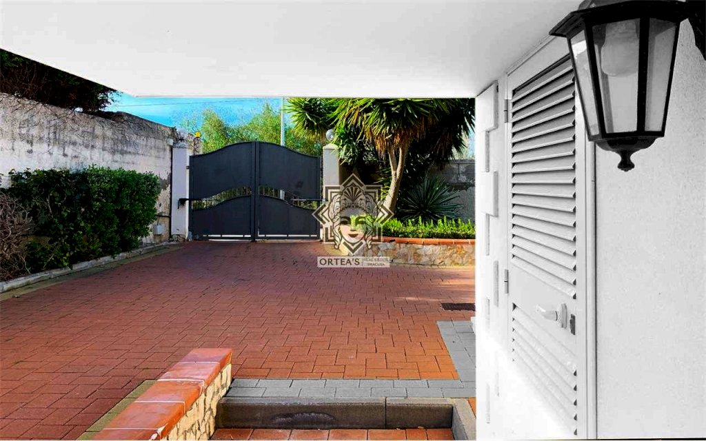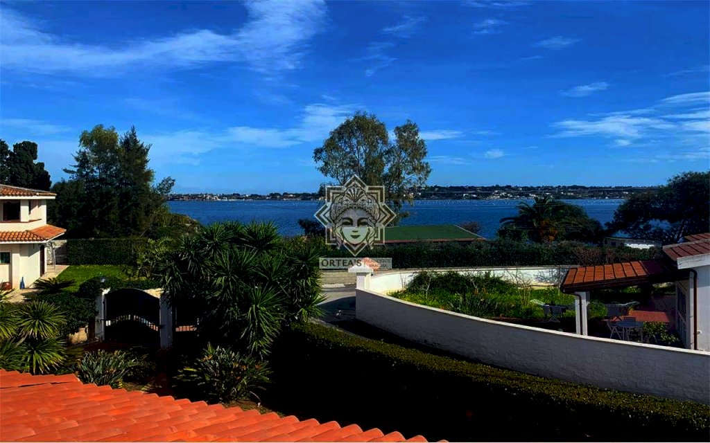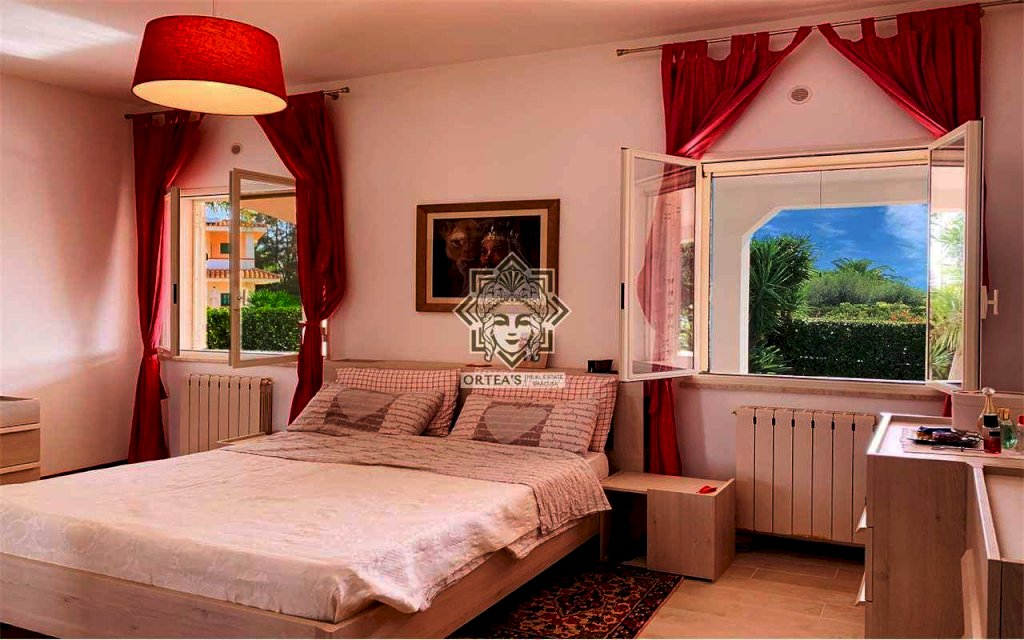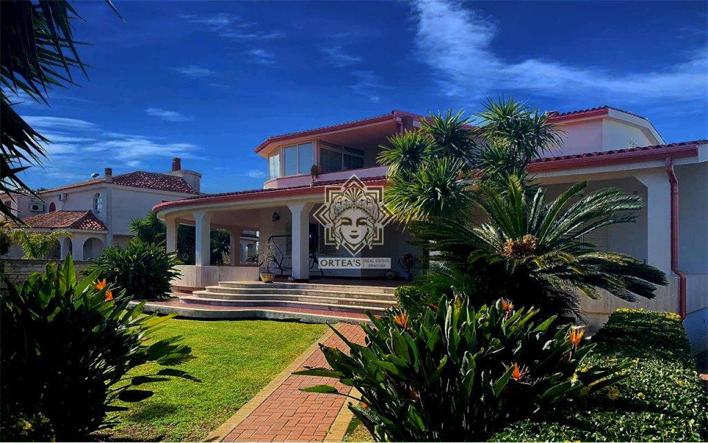 La villa è caratterizzata per i grandi ambienti interni, per un grande porticato e per la lluminosità degli ambienti interni grazie alle tante finestre dalle quali è possibile godere oltre che della vista del mare del golfo di Siracusa anche della vista dell'isola di Ortigia con in primo piano il castello Maniace e non per ultima la suggestiva vista delle Saline della riserva naturale con la costante presenza di uccelli migratori tra cui i fenicotteri Rosa, gli aironi, i cavalieri d'italia e il cigno Reale oltre ad una ricca flora tipica di questa area tra cui il rinomato Papiro. La villa è così costituita: il piano terra rialzato che dispone di un appartamento indipendente con grande sala soggiorno con cucina a vista due camere da letto matrimoniali, due locali bagno con doccia e una grande veranda coperta che si sviluppa su due lati; su questo livello un altro appartamento indipendente con soggiorno cucina, una grande dispensa, una grande camera da letto e due locali bagno con doccia; il piano primo che dispone di un altro appartamento indipendente con un soggiorno living con ampie finestre, una cucina abitabile, due locali bagno con doccia e due belle verande con vista mare, della riserva naturale e dell'isola di ortigia. Il piano in parte interrato dispone di un grande locale praticabile e fruibile con camere e una grande sala per attività ludiche. In questa villa non poteva mancare una piscina attrezzata ubicata in una parte del giardino con prato all'inglese e con anche un patio destinato al solarium.
