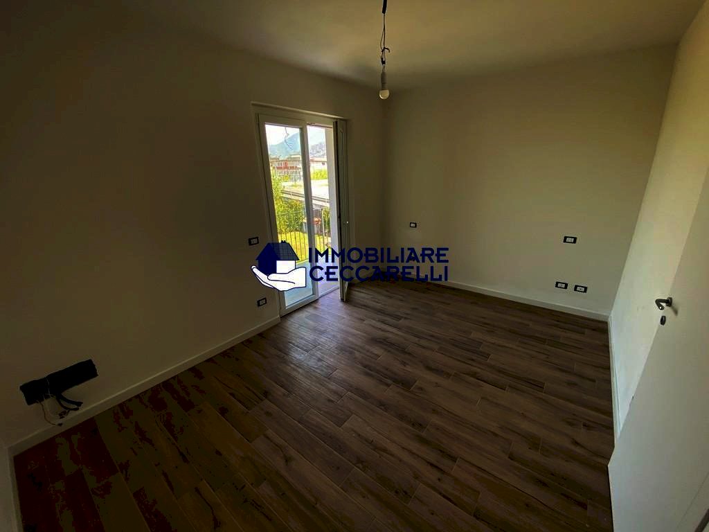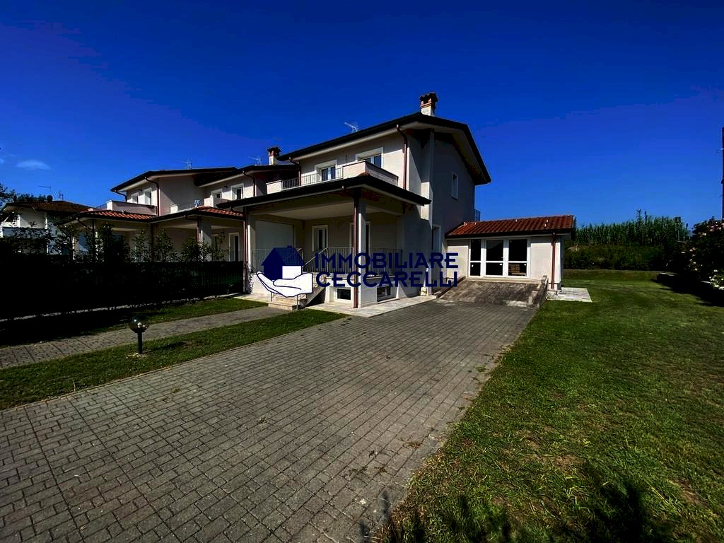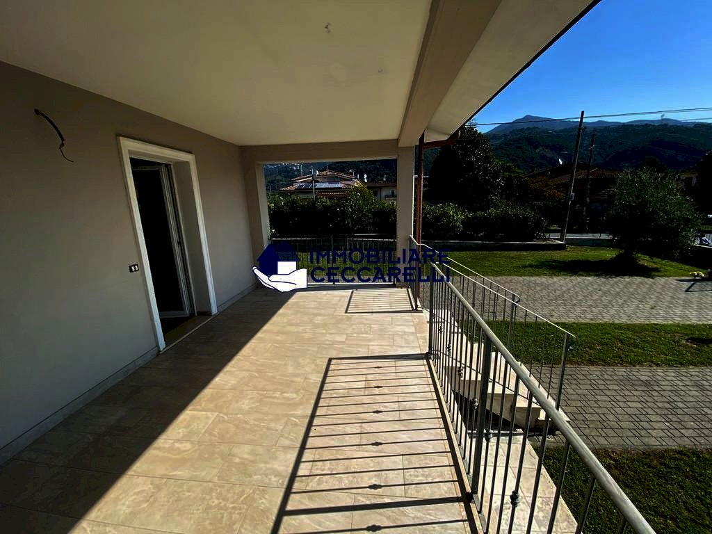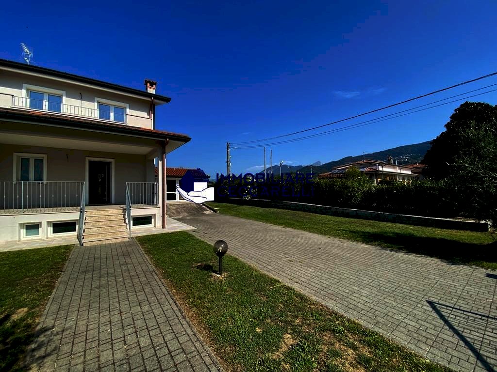 Montignoso - località Renella - A circa 2 km dal mare, in raffinato complesso immobiliare di recente costruzione, grande villetta d’angolo con giardino su tre lati. Disposta su più livelli, offre al piano terra: ingresso, ampio soggiorno/pranzo con veranda coperta per pranzi e cene all’aperto, cucina abitabile, un bagno e garage/studio;