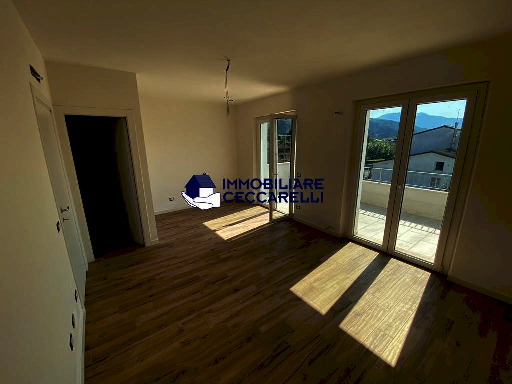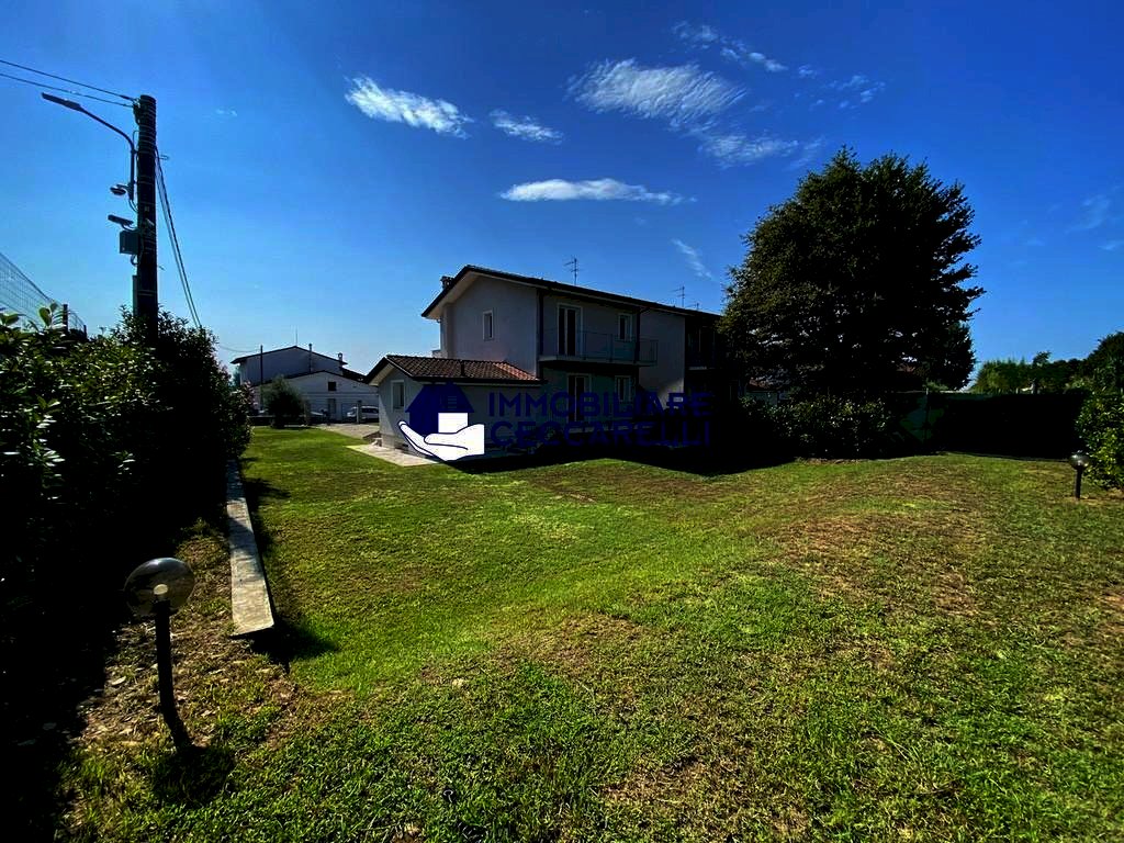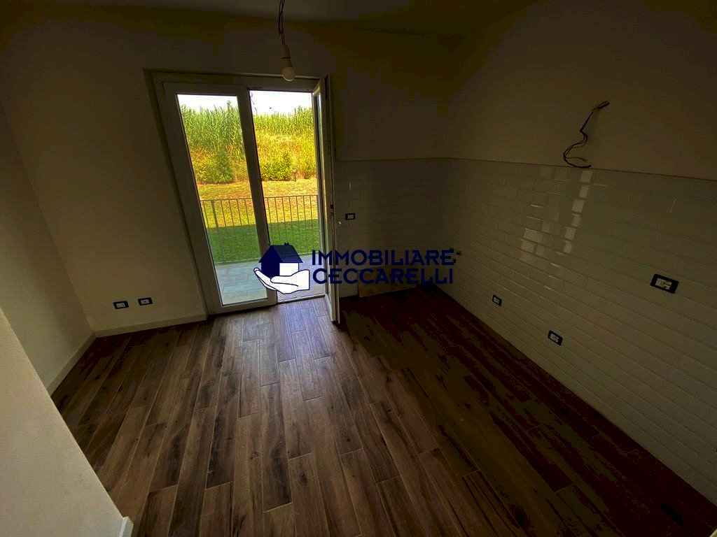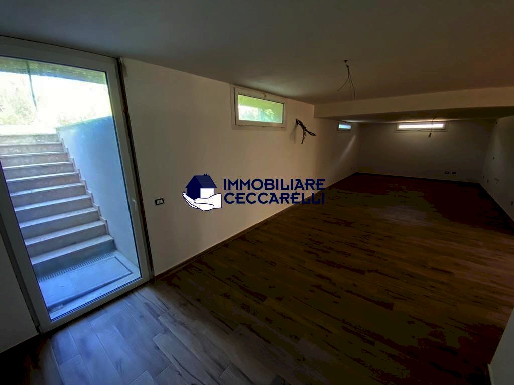 Montignoso - località Renella - A circa 2 km dal mare, in raffinato complesso immobiliare di recente costruzione, grande villetta d’angolo con giardino su tre lati. Disposta su più livelli, offre al piano terra: ingresso, ampio soggiorno/pranzo con veranda coperta per pranzi e cene all’aperto, cucina abitabile, un bagno e garage/studio;