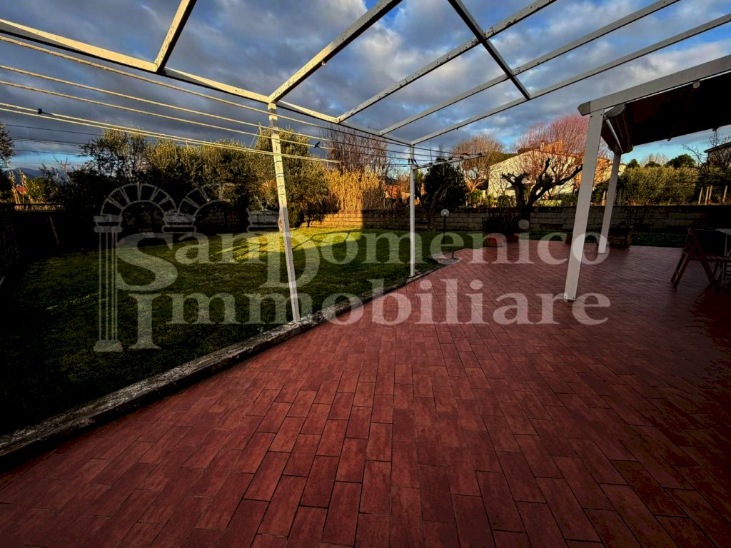 Nella parte esterna troviamo un cancello carrabile d'entrata e un cancellino pedonale che conducono all'ampio giardino recintato dove si trova un ampio resede piastrellato con pergola apribile elettricamente, e gli infissi sono tutti in legno, internamente, e esternamente con materiale che non si deteriora nel tempo unitamente a zanzariere presenti in tutta la casa.